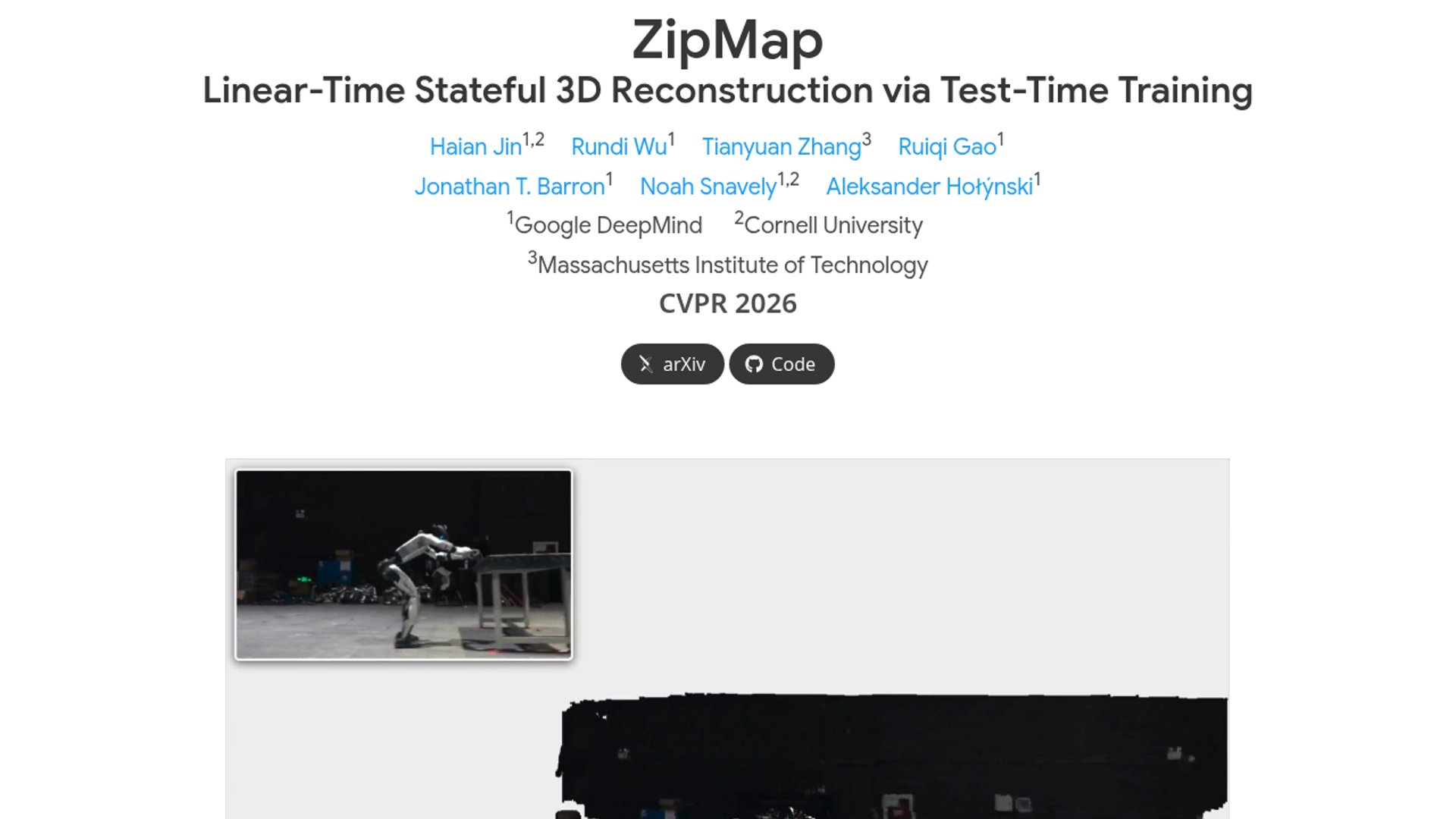 ZipMap is a CVPR 2026 paper from Google DeepMind, Cornell, and MIT that uses test-time training to compress long image sequences into a compact scene state for linear-time 3D reconstruction. The model reconstructs 750 frames in under 10 seconds on one H100 while matching or beating quadratic baselines like VGGT and π³ across several pose, depth, and point-map benchmarks.