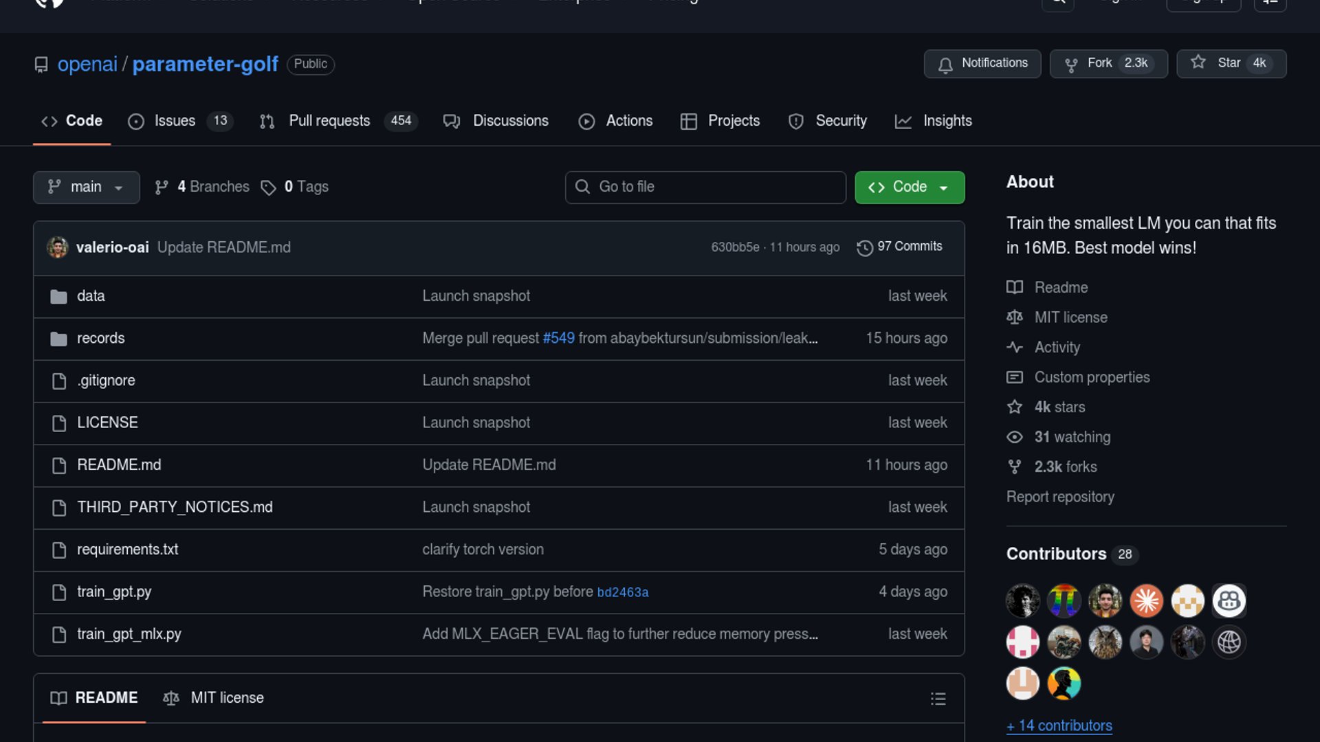 OpenAI's Parameter Golf challenge asks participants to fit a pretrained language model into a 16 MB artifact and train it in under 10 minutes on 8xH100s. The Claude contributor ranking mostly reflects the repo's PR approval flow, not OpenAI's internal tooling.