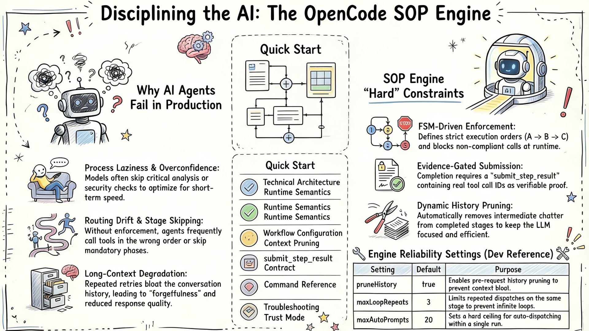 This feels like the right answer for teams that are tired of “best effort” agent behavior and want process they can actually enforce. Hard gating in `tool.execute.before` is stronger than prompt-only guardrails because invalid calls can be blocked before they happen. Requiring `submit_step_result` with real `evidence.callIds` makes “looks done” outputs much harder to fake. The history-pruning angle matters: long-context degradation is a real failure mode in agent workflows, especially after retries and detours. The tradeoff is operational overhead; somebody has to author and maintain the workflow profiles, so this is best for teams that already want standardized SOPs. The project reads more like agent governance infrastructure than a flashy end-user app, which is exactly why it may age well.