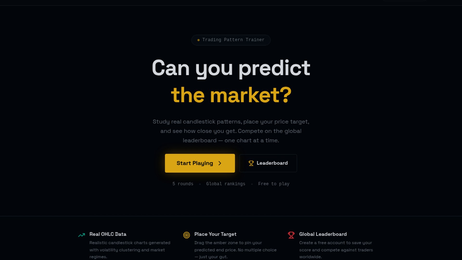 tradeguessr is a free trading-pattern trainer that shows you real candlestick charts, asks you to place a price target, and then reveals how close you got. The product leans into repetition and pattern recognition rather than theory, with a global leaderboard and short five-round sessions that make practice feel more like a game than a course.