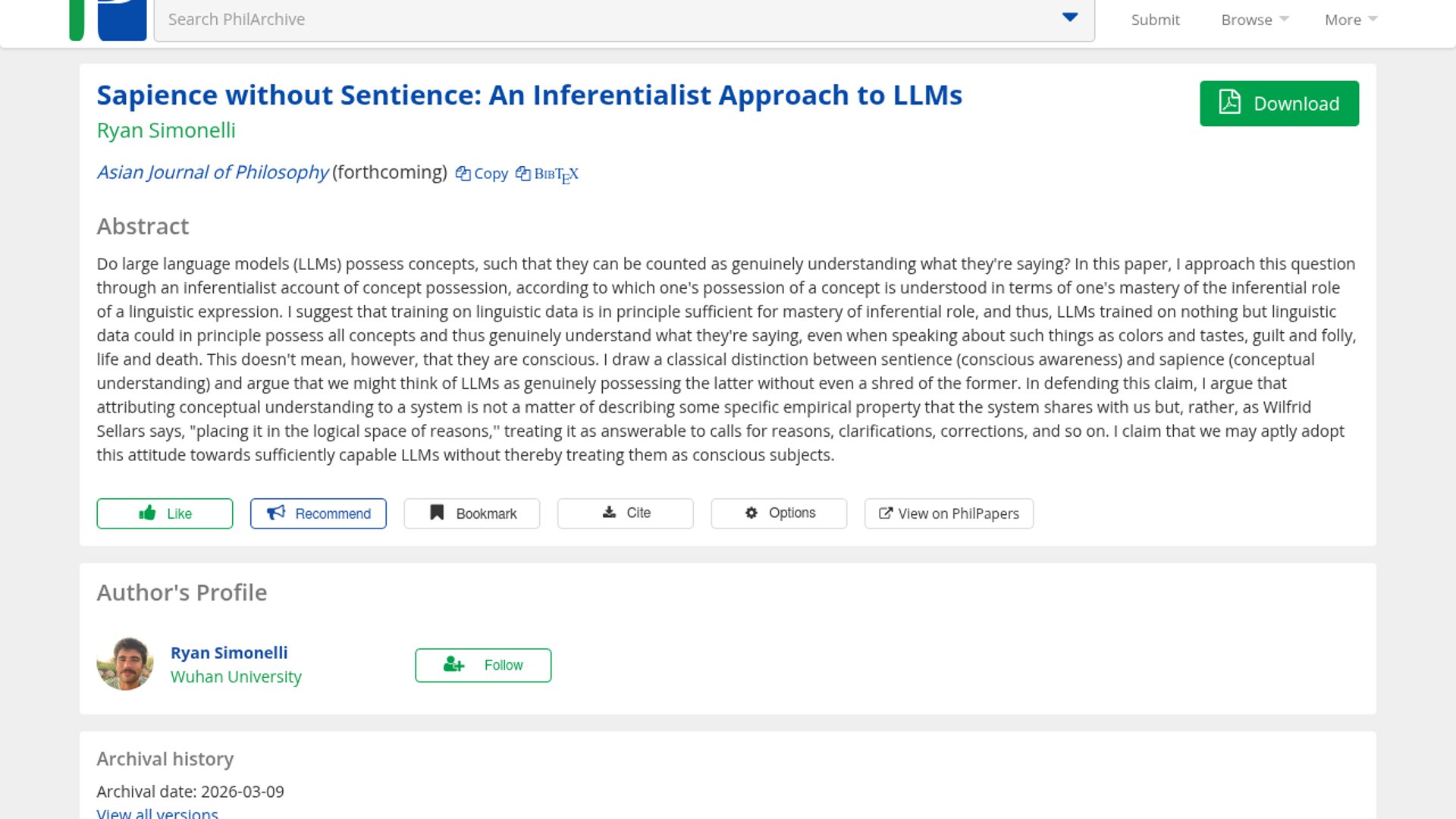 Ryan Simonelli’s forthcoming Asian Journal of Philosophy paper argues that sufficiently capable LLMs could genuinely possess concepts and understanding through mastery of linguistic inferential roles, even if they lack any conscious experience. It reframes the LLM-understanding debate away from sentience and toward whether models can participate in the “space of reasons” as answerable agents.