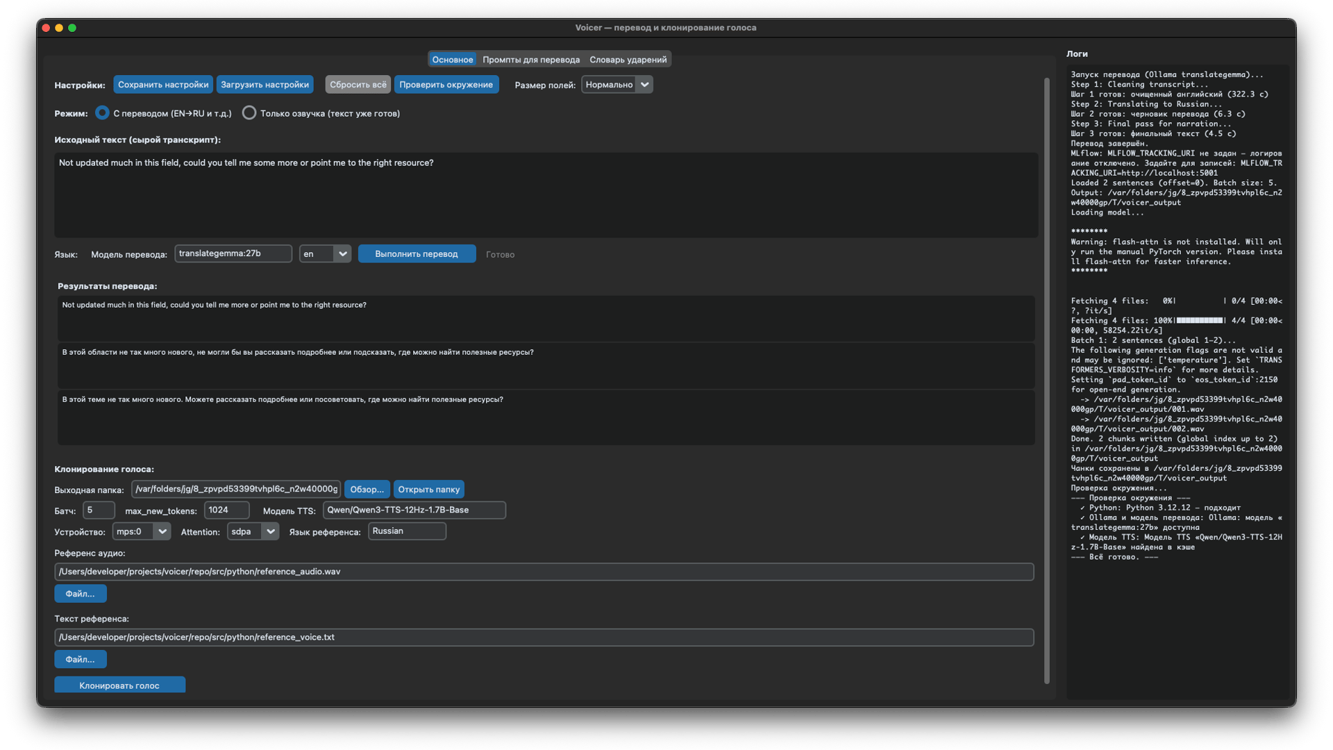 Voicer is a local-first desktop app and CLI for cleaning subtitles, translating them with Ollama-backed translategemma, and generating cloned voiceovers with Qwen3-TTS. It is meant to turn video re-voicing from a manual, one-off chore into a repeatable pipeline.
