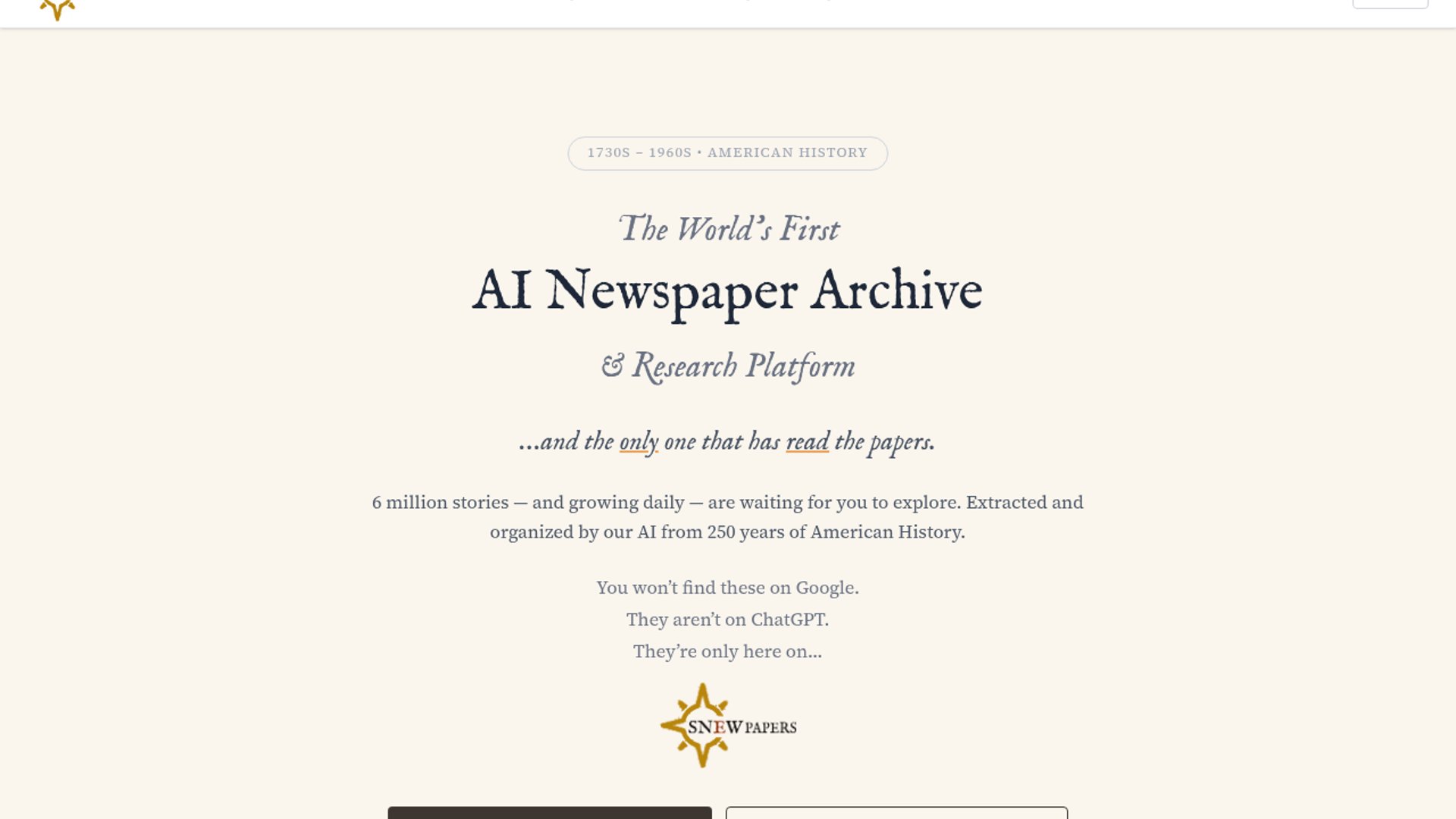 SNEWPapers is positioning itself as an AI-first archive of newspaper history, with machine-read extraction across 250 years of content, 6 million-plus stories, ad filtering, categorization, semantic search, and an AI research assistant for exploring the collection. The pitch is straightforward and strong: access historical articles that are not surfaced in Google or common LLM training data, then organize and share them as collections.