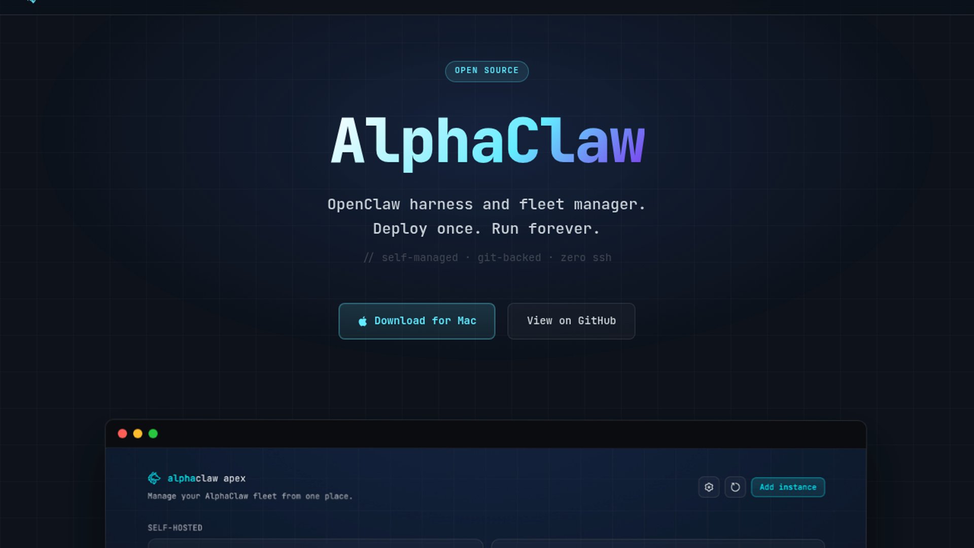 AlphaClaw Apex is an open-source Mac desktop app and fleet manager for OpenClaw, wrapping the CLI with a self-healing harness, web terminal, GitHub auto-commits, and multi-agent controls. It runs locally or through Railway, Render, or Docker templates, aiming to make agent ops manageable without SSH.
