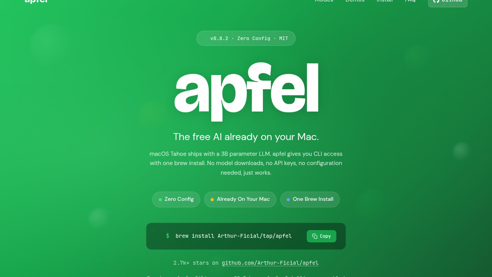 Apfel is an open-source Swift CLI that exposes Apple’s on-device FoundationModels LLM through the terminal, an OpenAI-compatible HTTP server, and an interactive chat. It runs locally on Apple Silicon Macs with no API keys, cloud dependency, or model download.