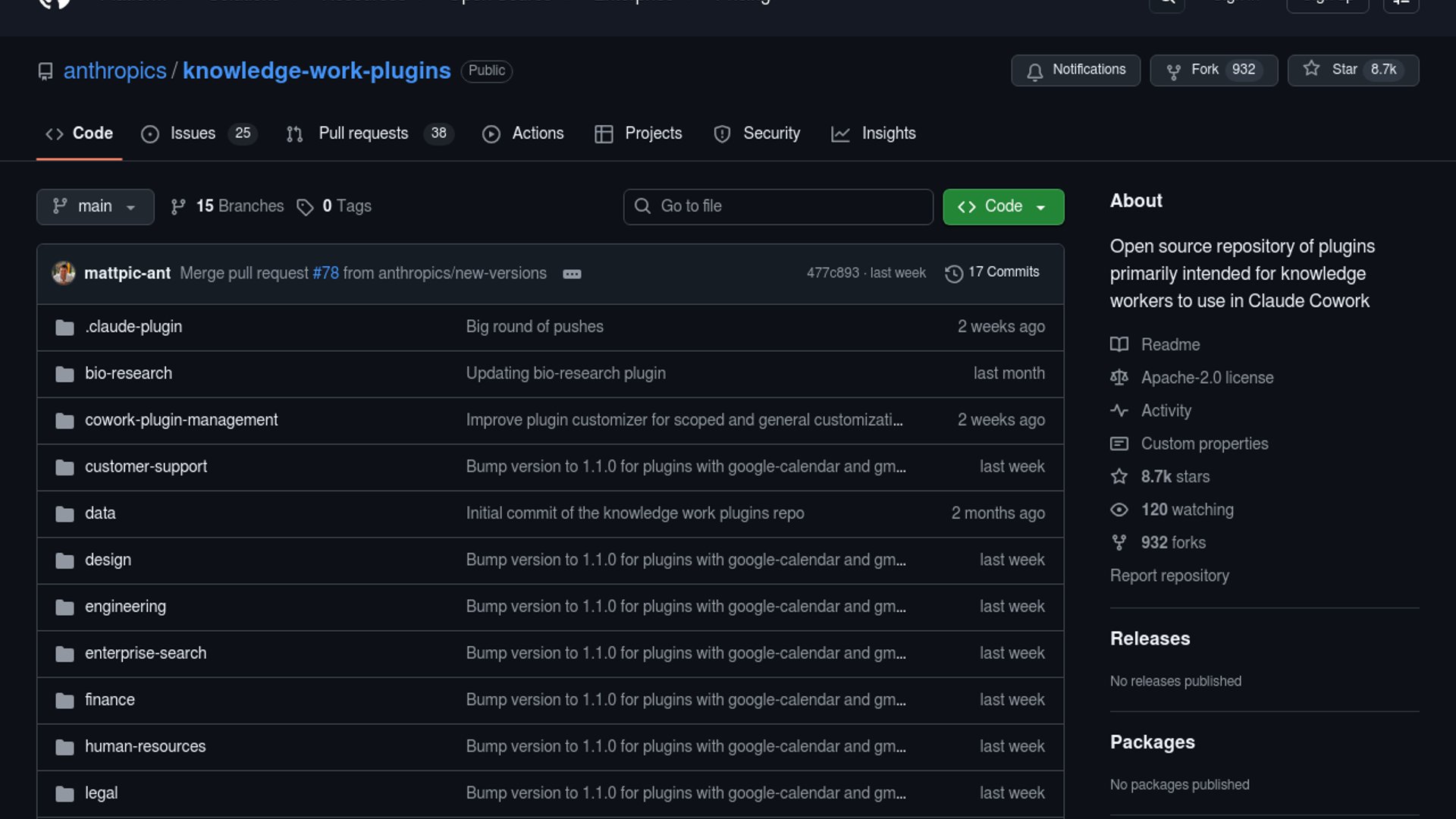 Anthropic has open-sourced Knowledge Work Plugins, a repo of 11 role-specific plugins for Claude Cowork and Claude Code spanning sales, legal, finance, data, product, and other knowledge-work functions. Each plugin bundles skills, slash commands, sub-agents, and MCP-based tool connectors into file-based workflows teams can install quickly, then adapt to their own stack and processes.