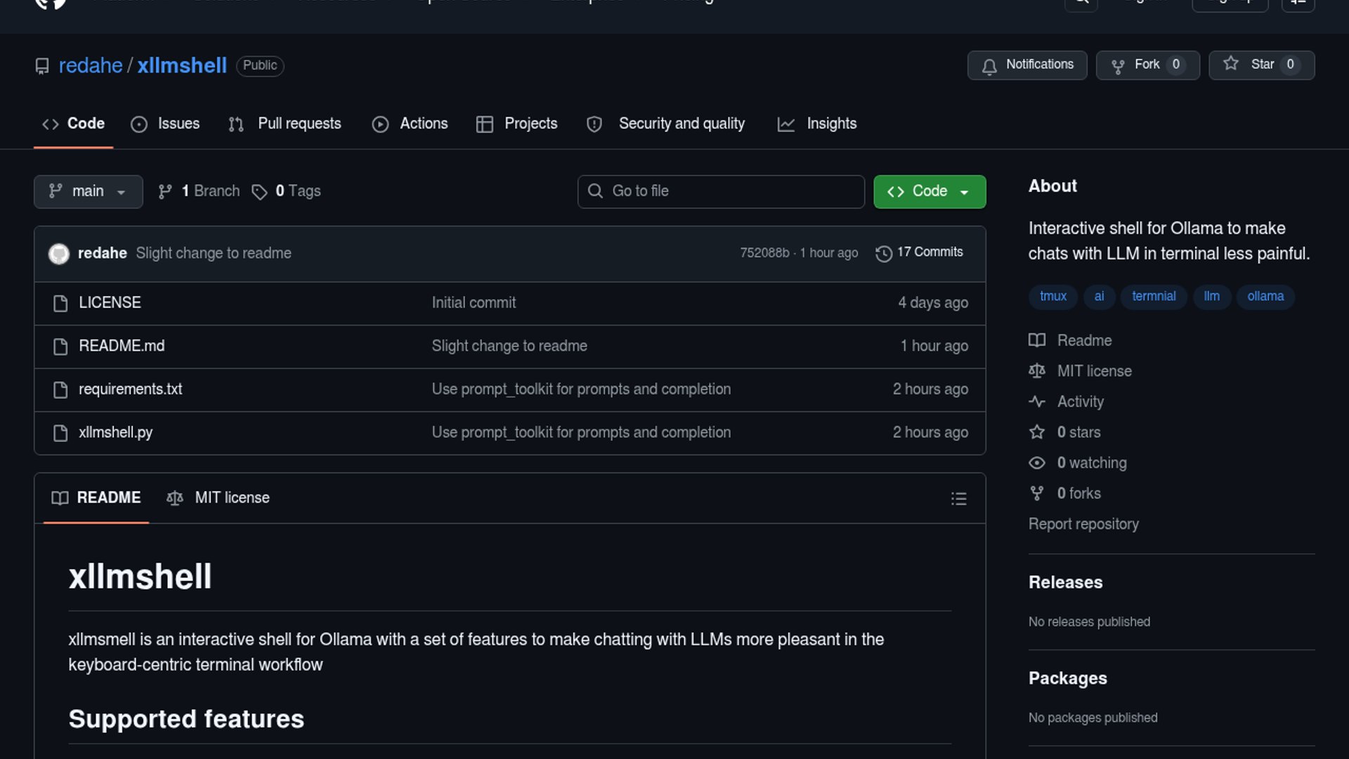 xllmshell is an interactive terminal shell for Ollama, prioritizing a keyboard-centric workflow with features like Markdown syntax highlighting, LaTeX-to-Unicode conversion, and seamless tmux integration for automated scrolling.