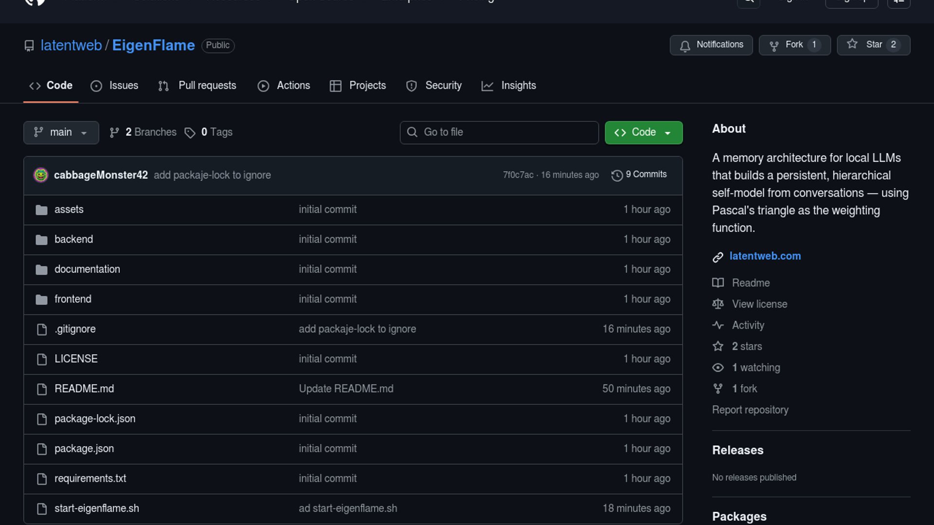 EigenFlame is a fully local memory architecture for LLMs that compresses conversations upward from episodes to beliefs, identity, meta-pattern, and archetype. It uses Pascal’s triangle-style weighting and a fixed seed prompt to bias retrieval toward distilled understanding instead of flat chat recall.
