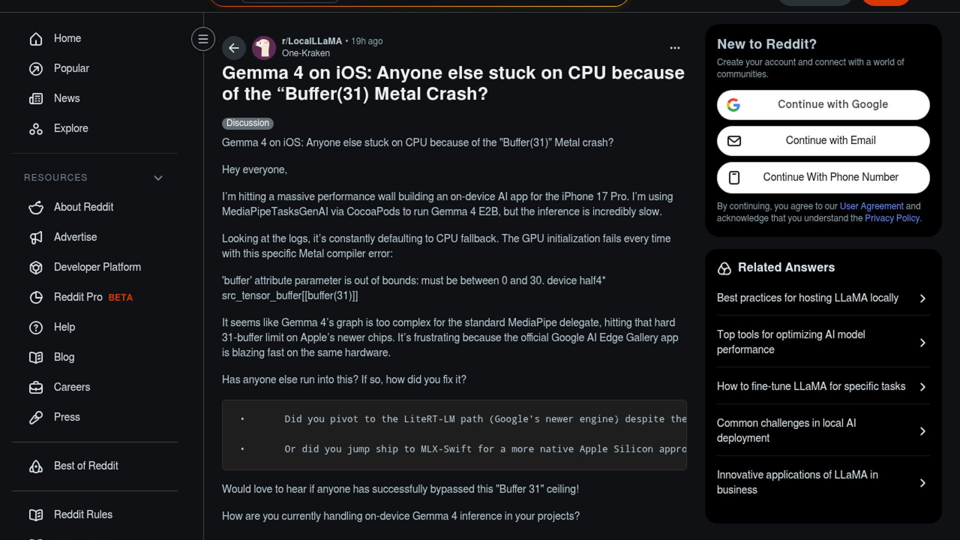 A Reddit user reports Gemma 4 on iOS falling back to CPU because MediaPipeTasksGenAI fails Metal compilation with a `buffer(31)` error. The discussion points to Apple’s 31-buffer shader limit as the blocker and asks whether developers are moving to LiteRT-LM or MLX-Swift instead.