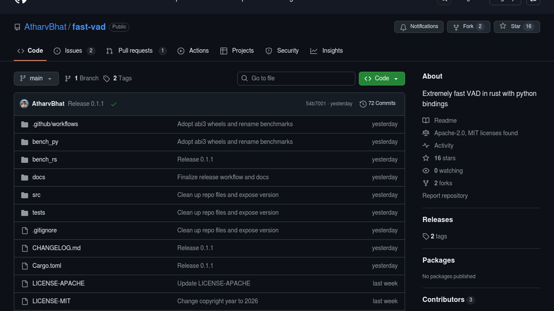 fast-vad is a new open-source voice activity detector released as both a Rust crate and Python package, with batch and streaming APIs for 8 kHz and 16 kHz audio. Instead of chasing model complexity, it uses a lightweight feature pipeline plus logistic regression to prioritize speed and easy integration.