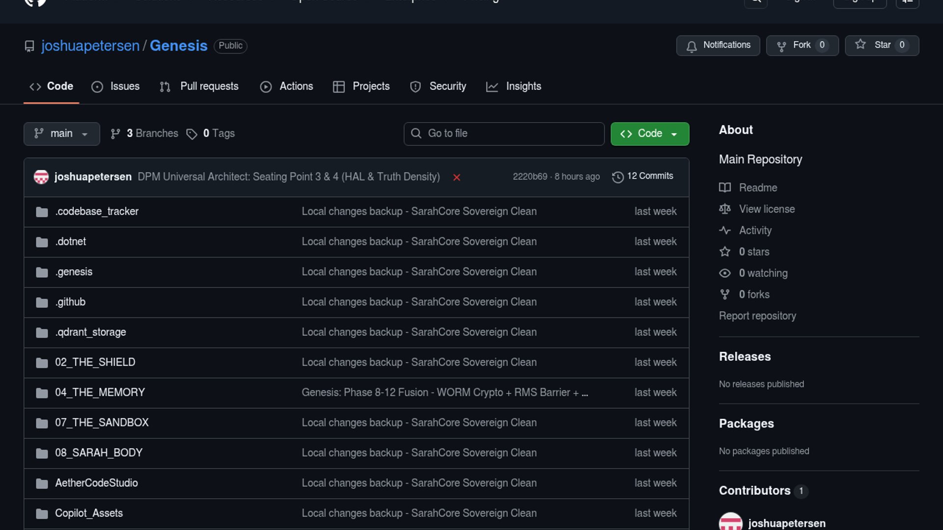 Joshua Petersen is recruiting collaborators around Genesis, Genlex, and DPM, a set of repos centered on a local SarahCore AI system with persistent memory and context continuity. The pitch reads more like an R&D manifesto than a launch, but it is clearly aimed at people willing to audit and extend the architecture.