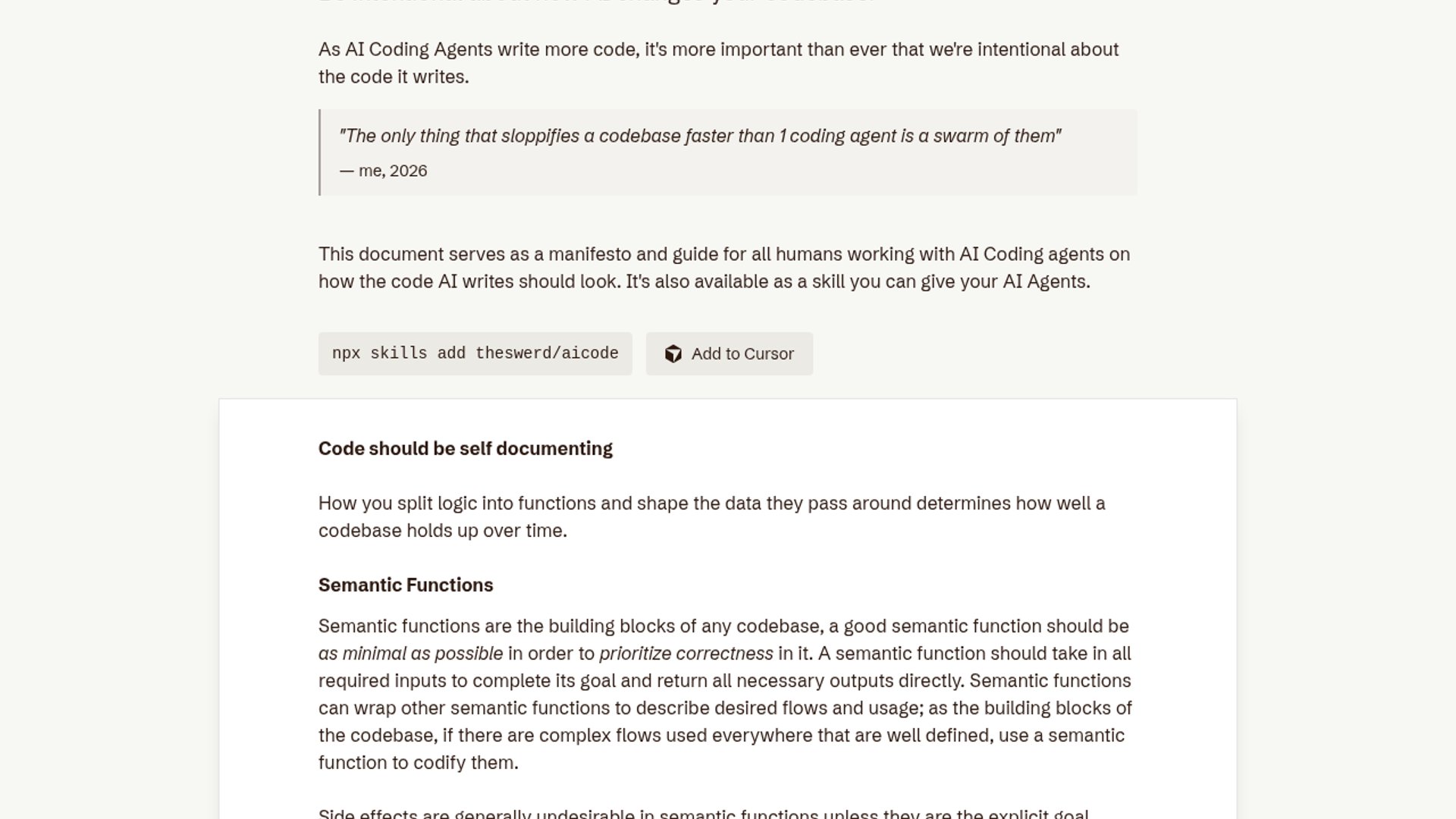 AI Code is Ben Swerdlow’s manifesto for shaping codebases so AI agents write code that stays readable, testable, and easy to reason about. It packages those ideas as an installable skill, so teams can apply the rules directly inside agent workflows.