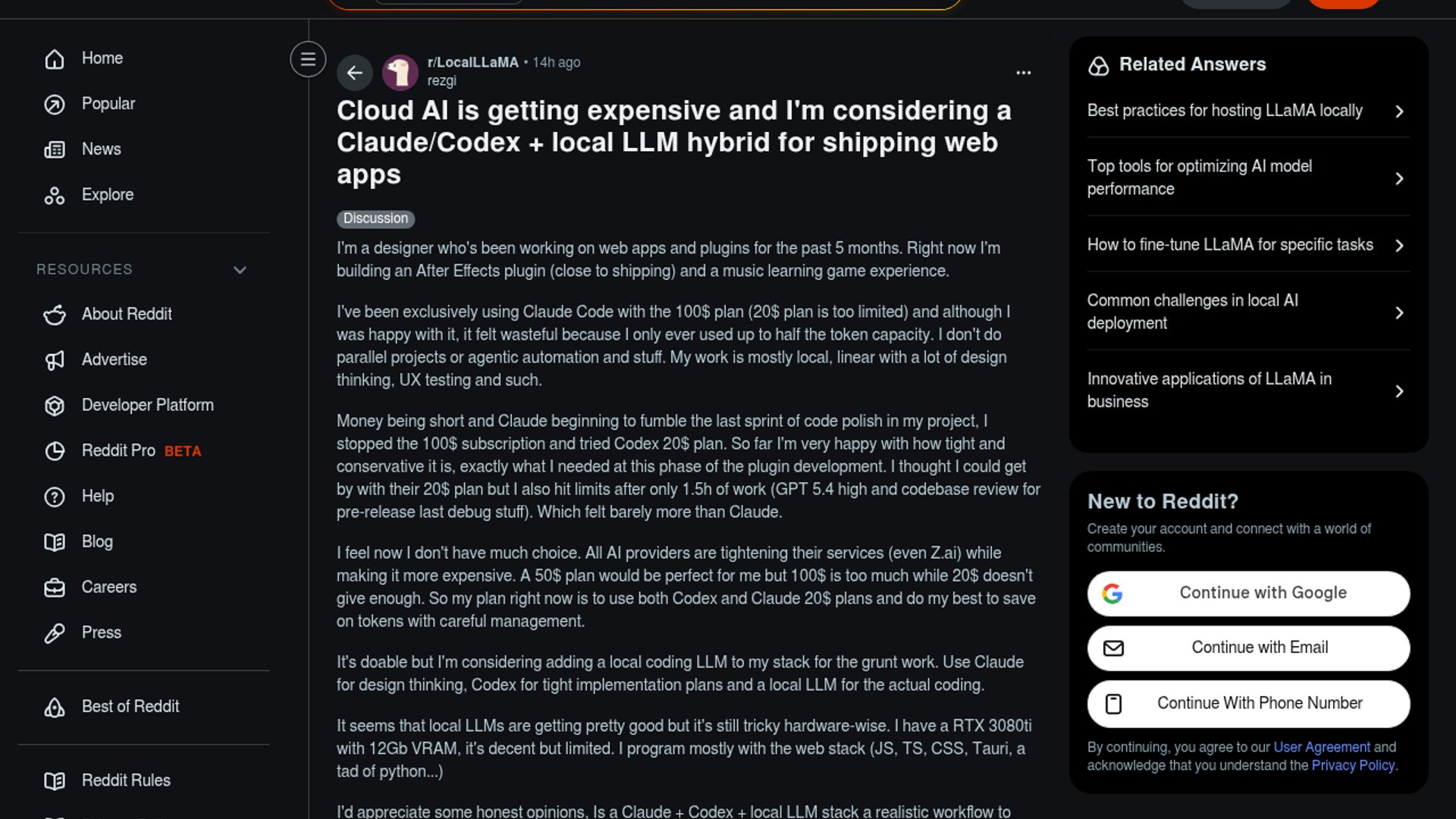 The post asks whether a two-cloud-plus-local setup is practical for shipping web apps on an RTX 3080 Ti 12GB, after the author found Claude Code useful but expensive, Codex tight and conservative but quota-limited, and is now considering a local coding model for boilerplate and lower-stakes coding tasks. The core constraint is budget versus capability: the author wants a cheaper workflow without losing enough quality to ship an After Effects plugin and a music-learning game.