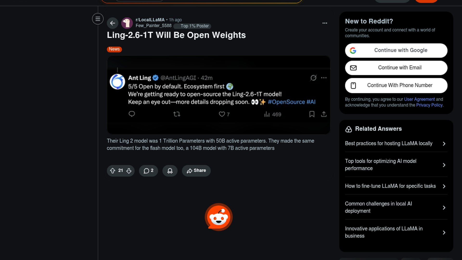 Ant Group’s Ant Ling team is signaling that Ling-2.6-1T will be released as open weights, with the Reddit post also claiming the same plan for Ling-2.6-flash. That would extend Ant Ling’s recent pattern of publishing big MoE models into the new 2.6 generation, including a 1T-parameter flagship and a smaller 104B Flash variant tuned for cheaper inference.