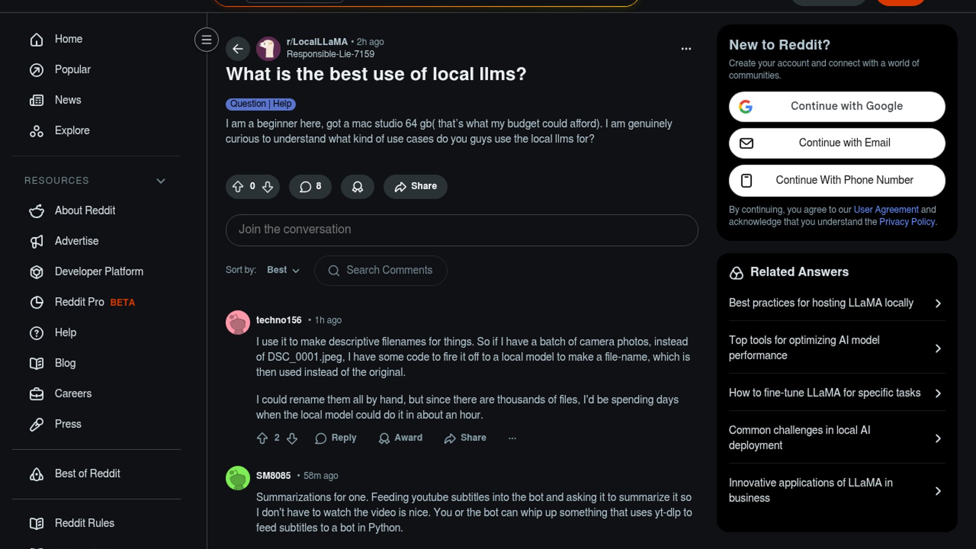 A beginner with a Mac Studio 64 GB asks what local LLMs are actually good for, and the discussion lands on concrete workflows rather than benchmark chasing. Commenters point to privacy-preserving tasks like summarizing documents or YouTube transcripts, batch file naming and organization, coding assistance, and multimodal jobs such as image or video tagging. A few replies also caution that local models still feel limited for serious front-line work, especially compared with stronger hosted models.