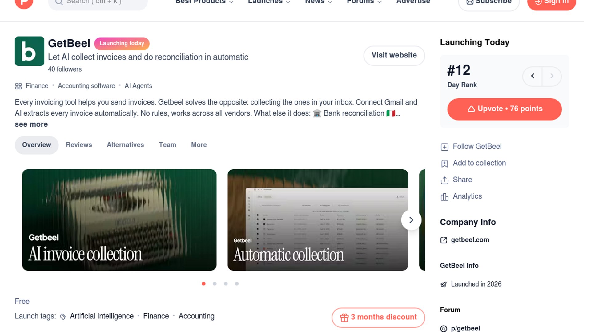 GetBeel is an AI-powered finance tool that connects to Gmail, pulls invoices and receipts automatically, and matches them against bank statements so founders and accountants stop chasing documents by hand. Its Product Hunt launch also highlights deeper accounting workflows like spend analytics, accountant access, and Italian e-invoicing support via SDI.