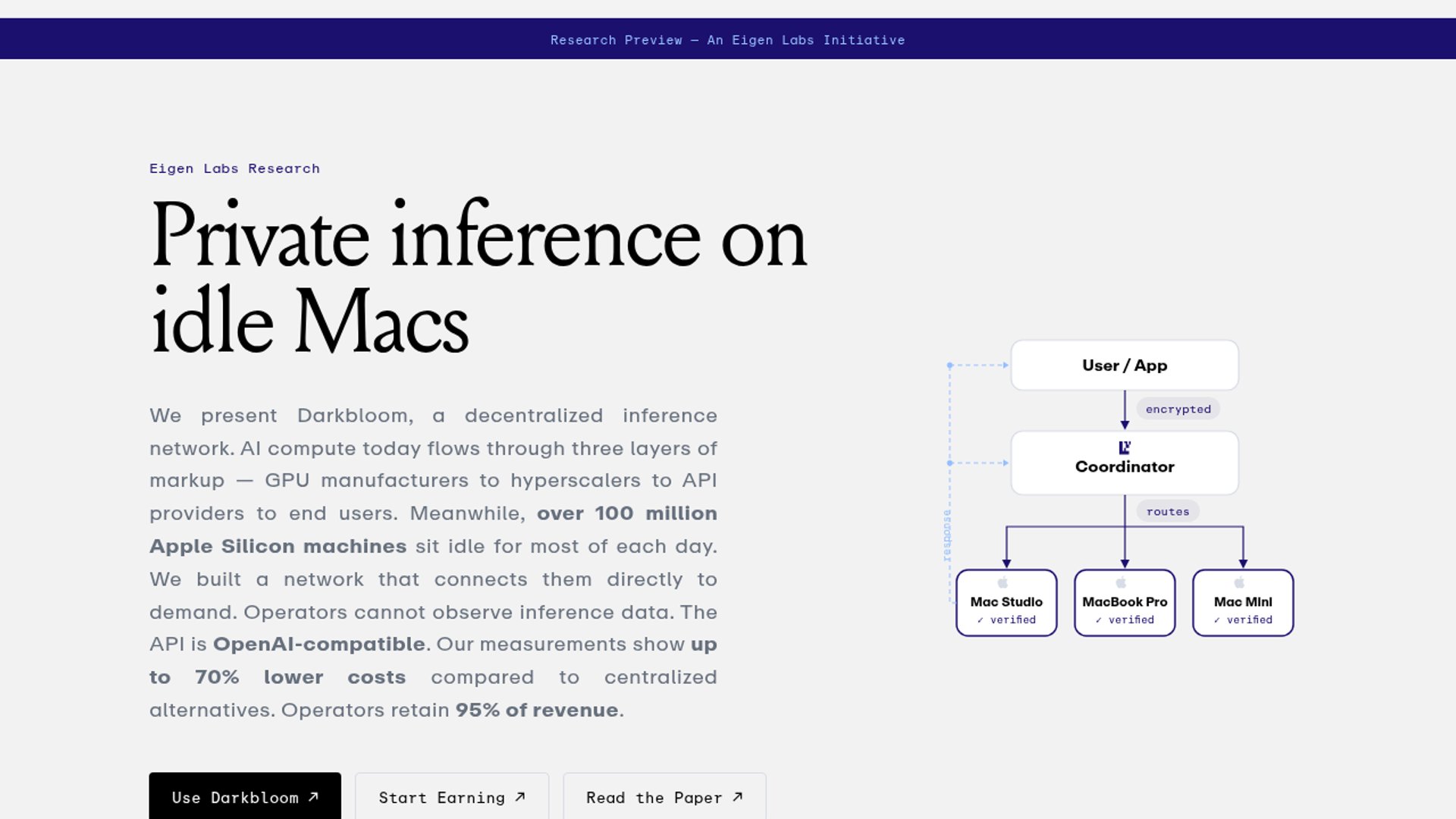 Darkbloom is an Eigen Labs research preview for decentralized AI inference on idle Apple Silicon Macs. It exposes an OpenAI-compatible API, claims encrypted private requests, and pitches lower costs plus revenue sharing for hardware owners.