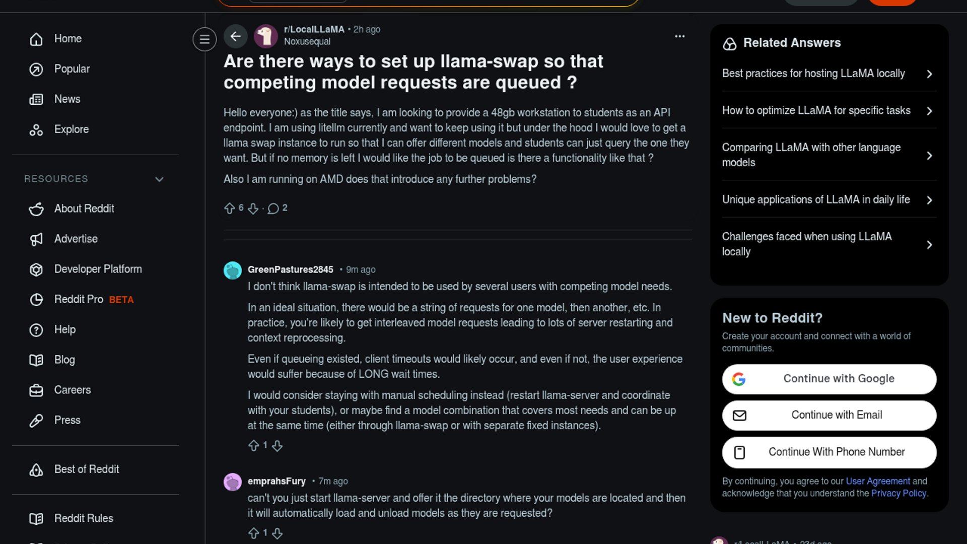 The Reddit thread asks whether llama-swap can queue requests when a model is already consuming scarce VRAM, so a student-facing LiteLLM endpoint does not just fail under load. It also asks whether AMD introduces extra friction; the real variable seems to be the upstream backend and container setup, not llama-swap’s proxy layer.