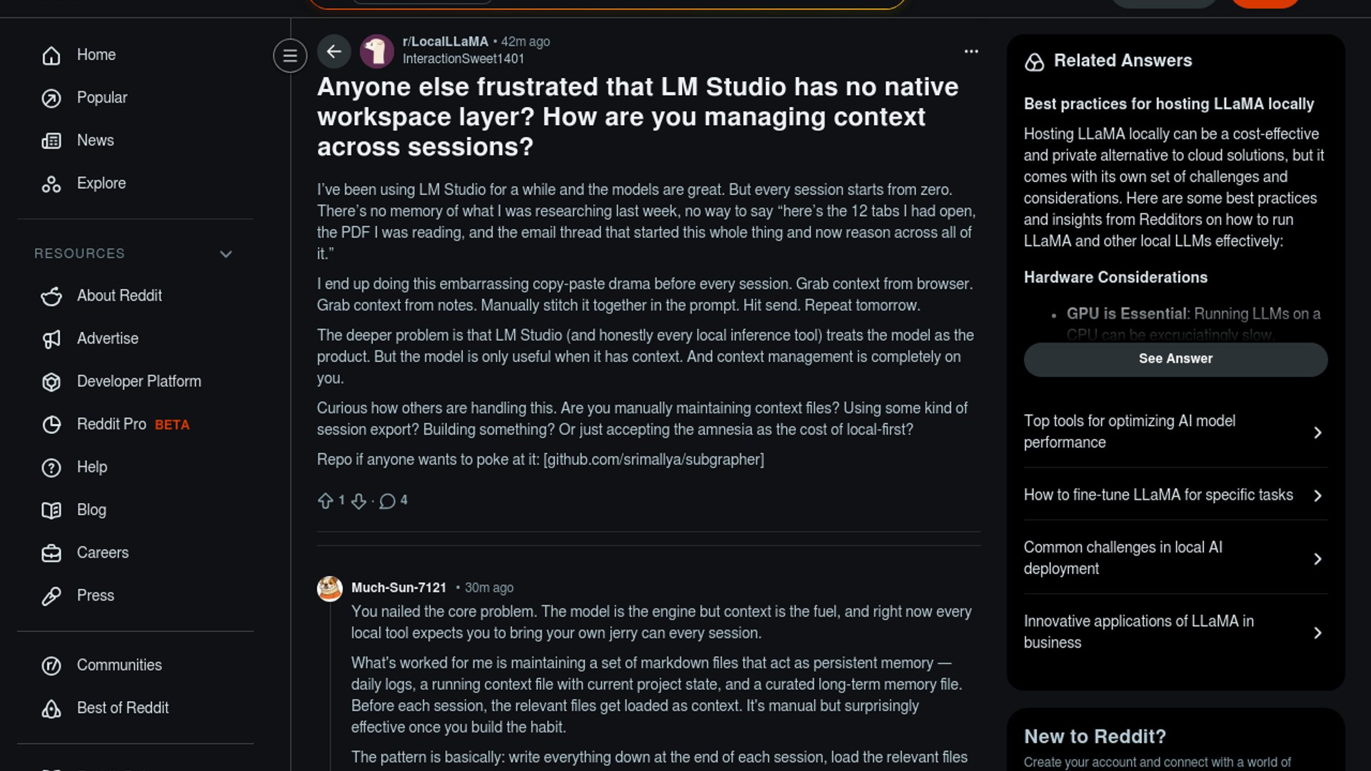 A Reddit thread in r/LocalLLaMA argues that LM Studio still lacks a native workspace memory layer, forcing users to manually rebuild context each session from tabs, notes, and docs. The post frames this as a broader local-LLM tooling gap and links to the Subgrapher repo as an attempt to solve persistent context orchestration.