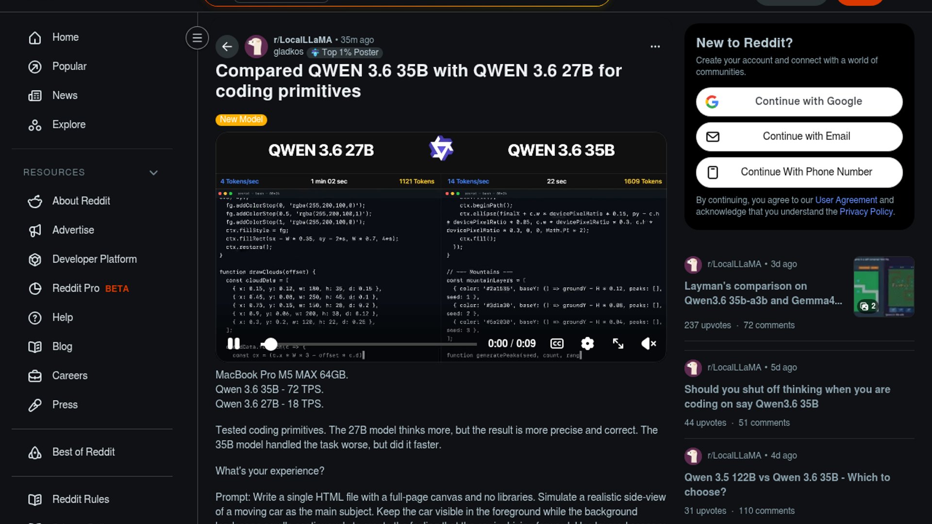 On a MacBook Pro M5 Max 64GB, the tester found Qwen3.6-35B much faster at 72 TPS, but Qwen3.6-27B produced more precise and correct coding-primitives output despite running at 18 TPS. The post frames this as a classic local-model tradeoff: throughput versus reliability.