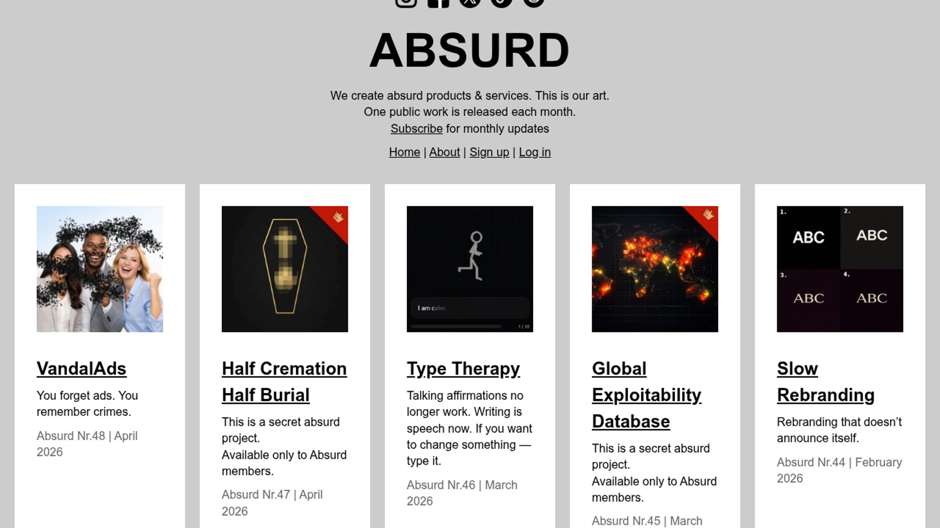 Absurd.website is an ongoing creative project where the maker ships one absurd web project every month, now at 48 total. The latest update frames the work less as playful experimentation and more as net art with a steady rhythm of one public project and one private members-only project each month. Recent examples include VandalAds, Type Therapy, Slow Rebranding, and Guard Simulator, all built around concept-first ideas rather than polish or utility.
