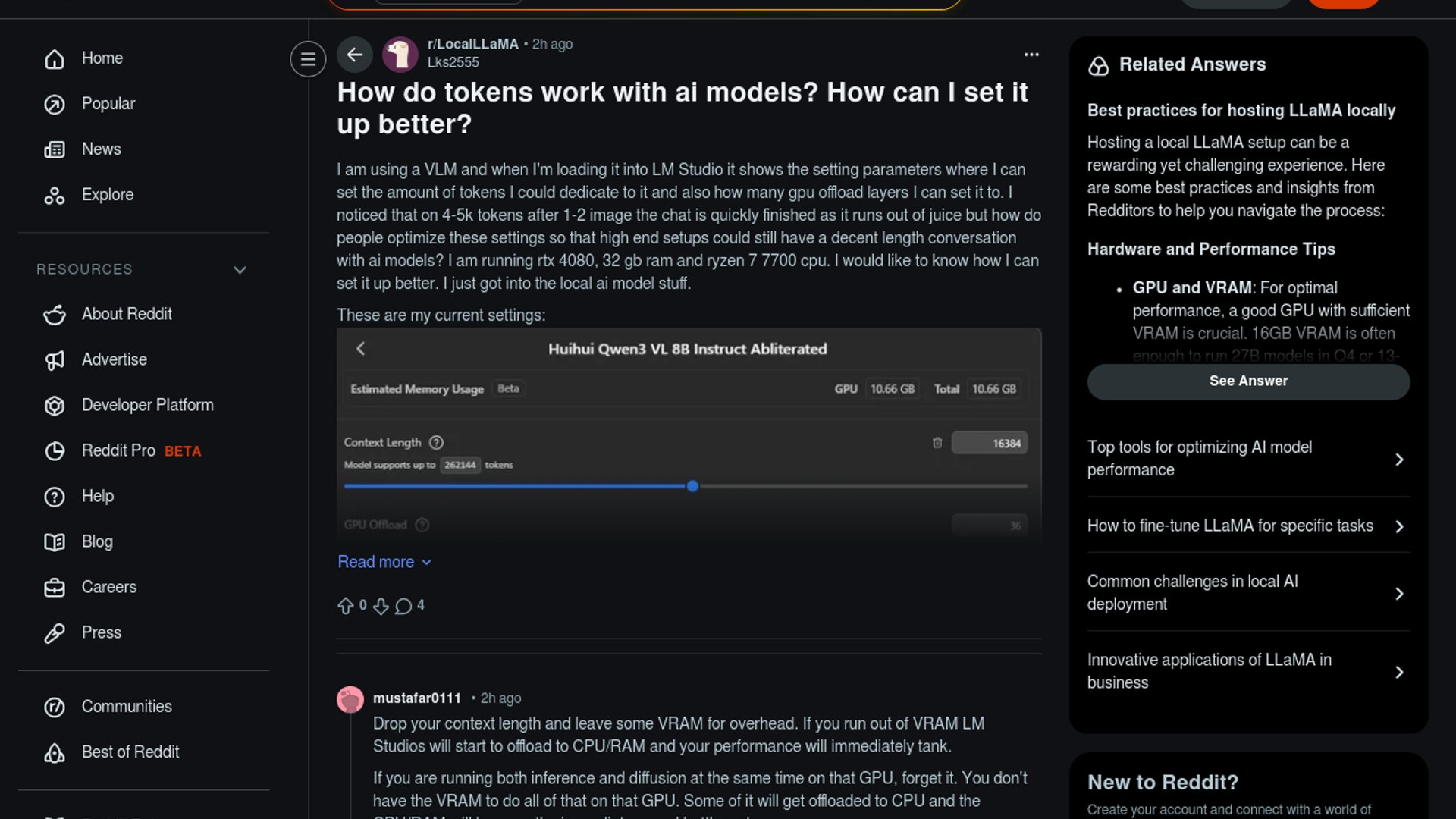 A LocalLLaMA user asks how to tune LM Studio for longer multimodal chats after a 4-5K token window gets exhausted by one or two images on an RTX 4080 system. The discussion spotlights the two practical levers local-model newcomers hit first: context-window allocation and GPU offload depth.