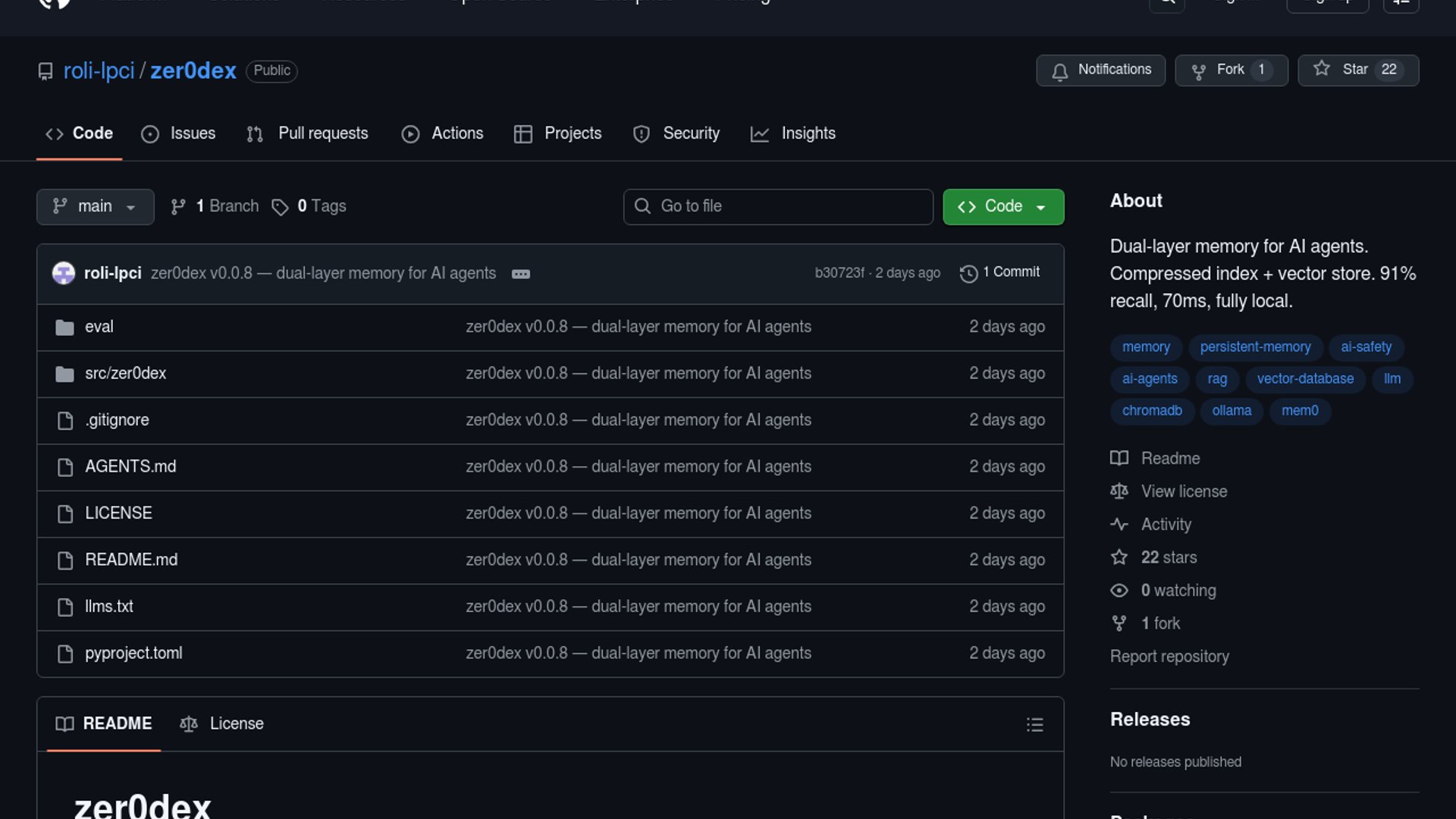 zer0dex is an open-source dual-layer memory system for local LLM agents that pairs a compressed in-context markdown index with ChromaDB retrieval injected via a pre-message hook. In the project’s 97-case self-run benchmark, it reports 91.2% recall versus 80.3% for full RAG, targeting offline agent workflows with low added latency.