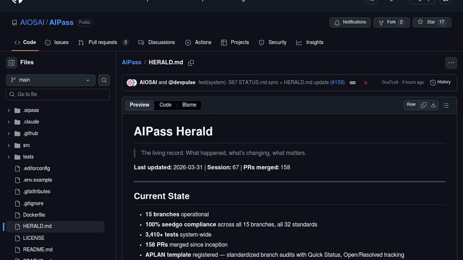 AIPass Herald is a living project log for the AIOSAI/AIPass multi-agent autonomous system. The file reads like a daily newspaper for the repo, summarizing current state, recent sessions, active work, milestones, and known issues so contributors can quickly see what changed, what is still open, and where the system stands operationally.