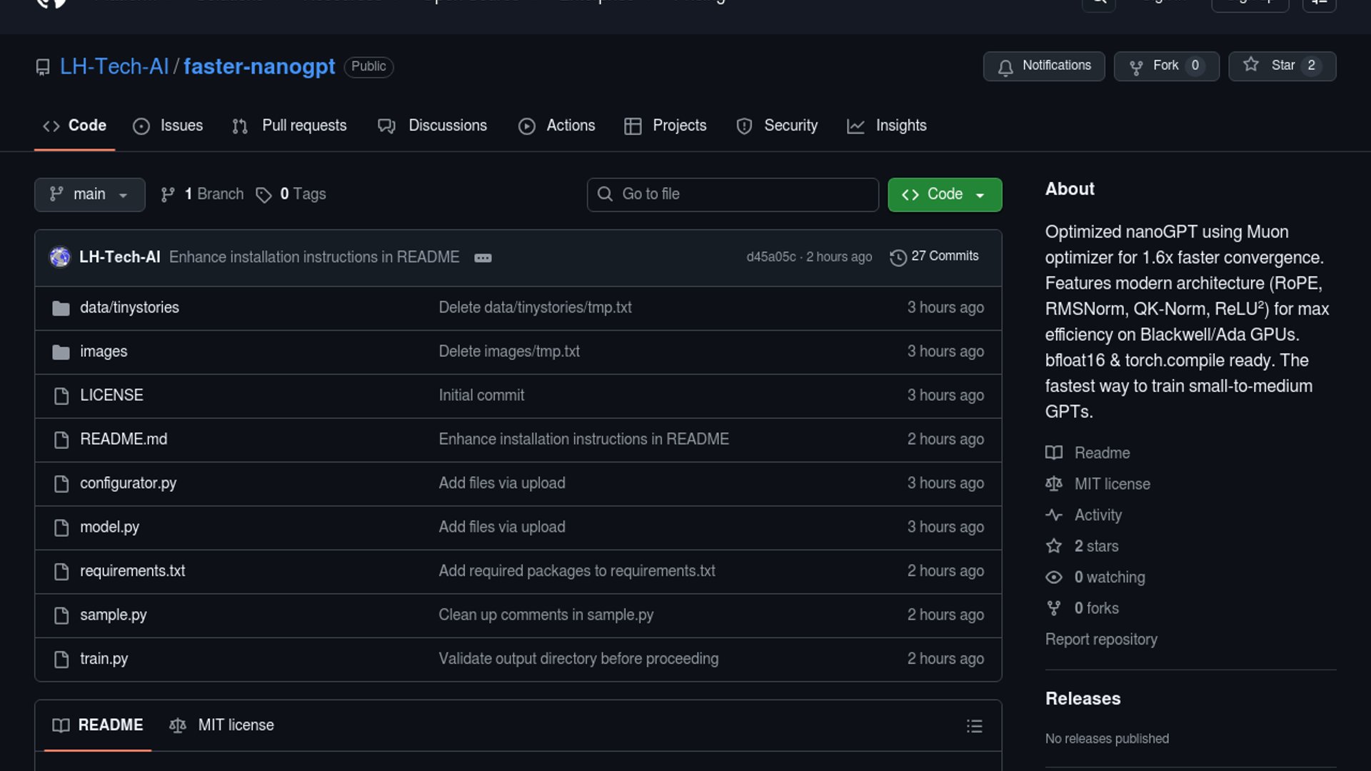 faster-nanogpt is an open-source fork/evolution of nanoGPT that swaps in Muon and a modern small-model stack (RoPE, RMSNorm/QK-Norm, ReLU², logit soft-capping) to improve training efficiency. In the author’s TinyStories 7M benchmark, it reports reaching comparable loss in about 33% fewer iterations (roughly 1.6x sample efficiency), with emphasis on single-GPU usability and `torch.compile`/`bfloat16` readiness.