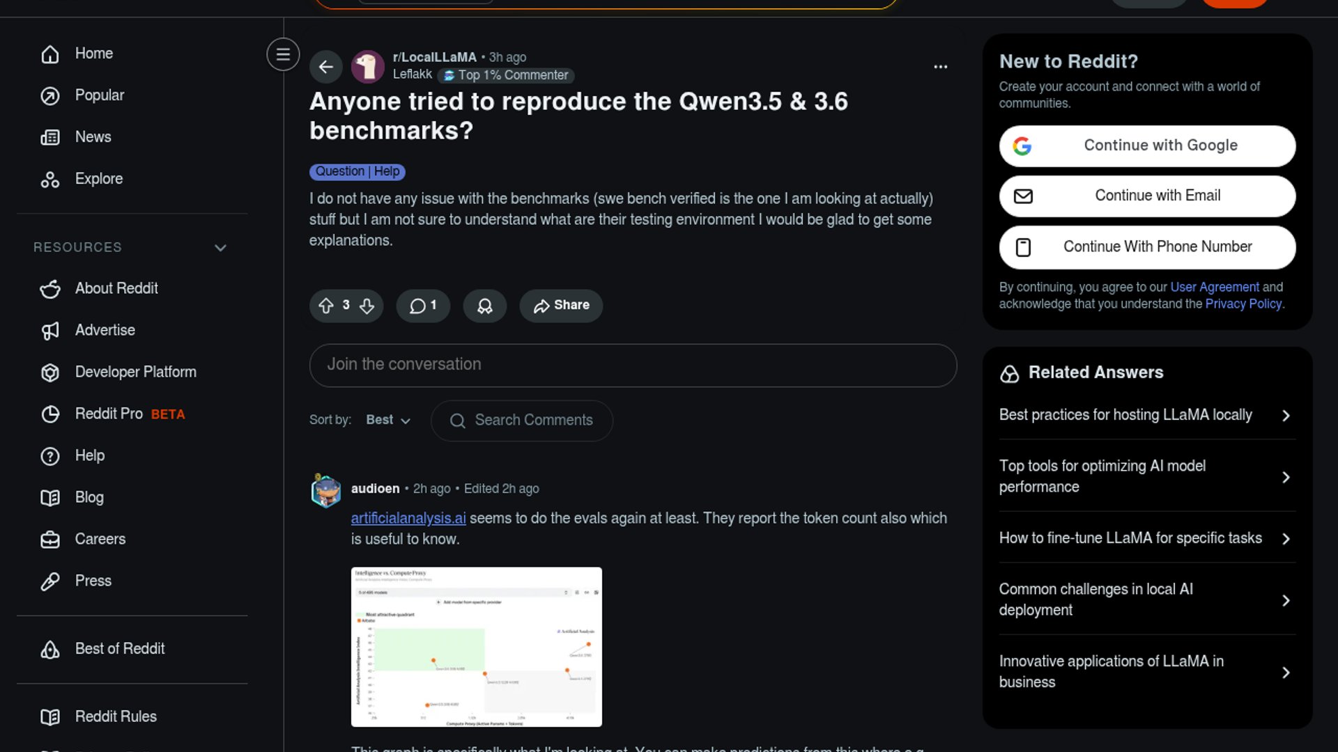 This Reddit post is a reproducibility check on the Qwen3.5 and Qwen3.6 benchmark numbers, with the author specifically asking what testing environment was used for SWE-bench Verified. The official Qwen model card shows these results are not “just run the model and score it” numbers: SWE-bench Series uses an internal agent scaffold with bash and file-edit tools, a 200K context window, temp=1.0, and top_p=0.95, while the SWE-bench project itself uses a Docker-based harness for reproducible evaluation. In practice, the benchmark reflects an agent loop plus tooling, not raw chat inference.