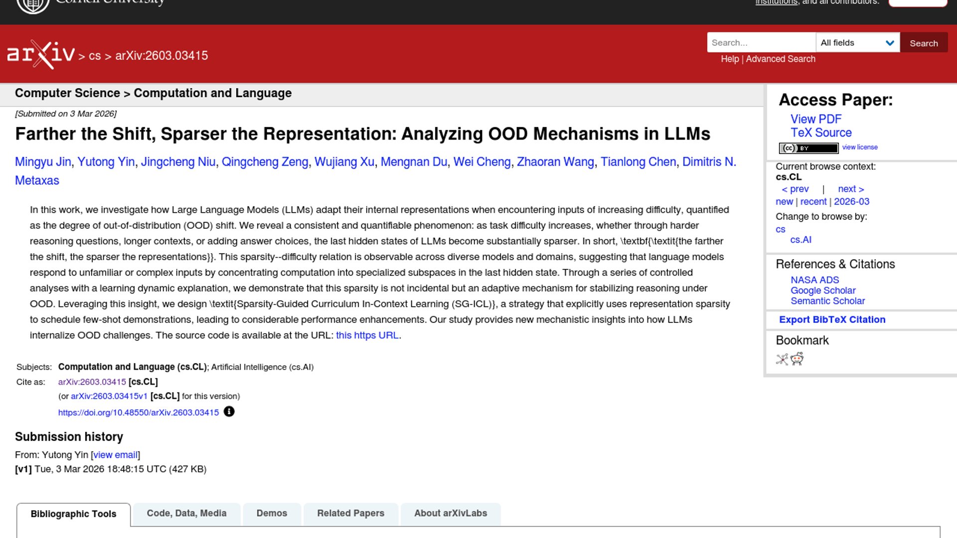 A new arXiv paper reveals that LLMs shift from distributed to sparse internal representations as input difficulty increases — a mechanism the authors call "the farther the shift, sparser the representation." The researchers also introduce SG-ICL, a method that exploits this sparsity signal to order few-shot demonstrations and improve model performance on hard problems.
