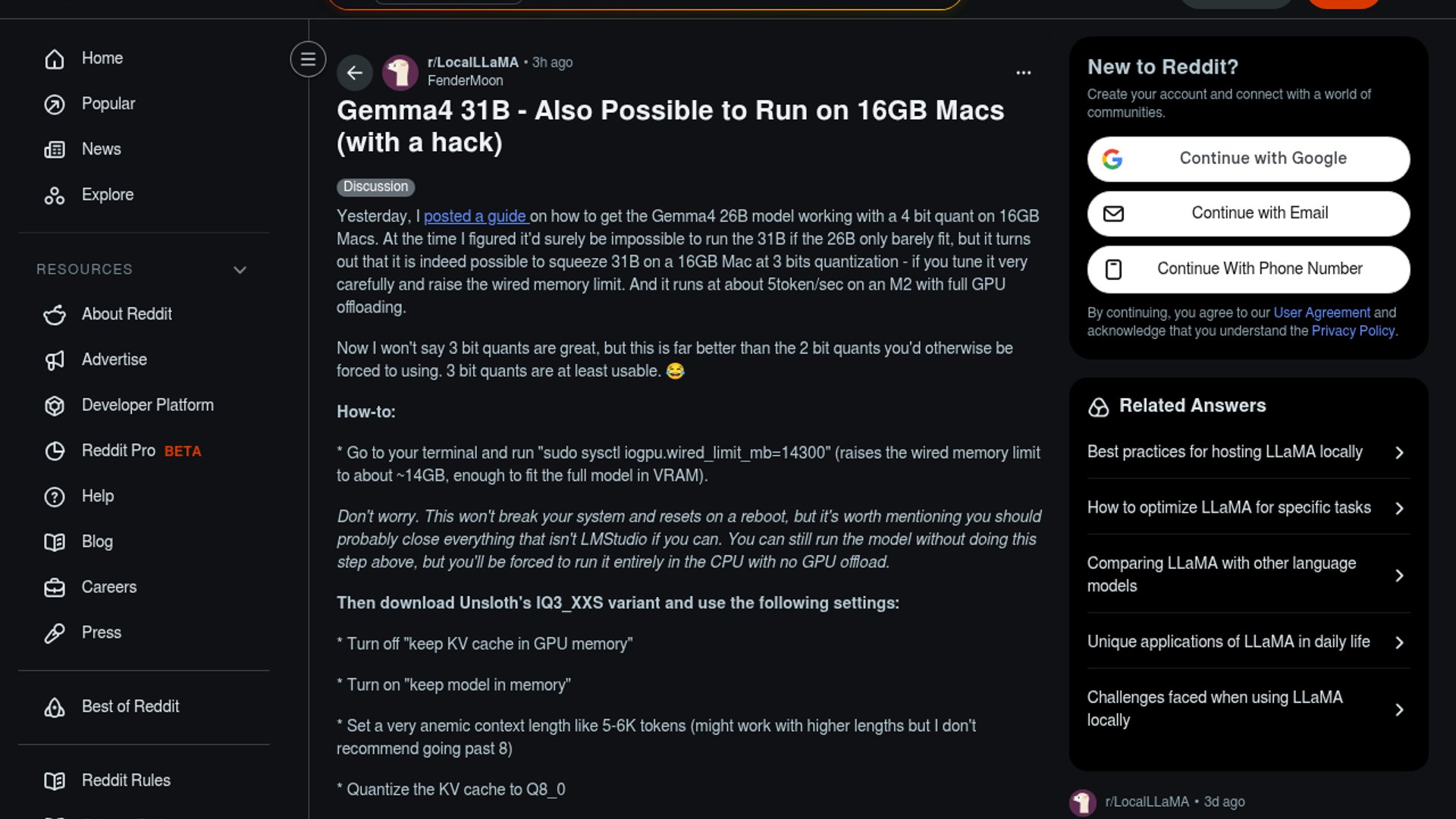 A Reddit guide shows Gemma 4 31B can run on a 16GB Mac if you push it to 3-bit quantization, cap context to around 5-6K tokens, and raise the wired memory limit. It works, but the tradeoff is obvious: roughly 5 tokens/sec and a lot of tuning for a model that is still easier to run as 26B.