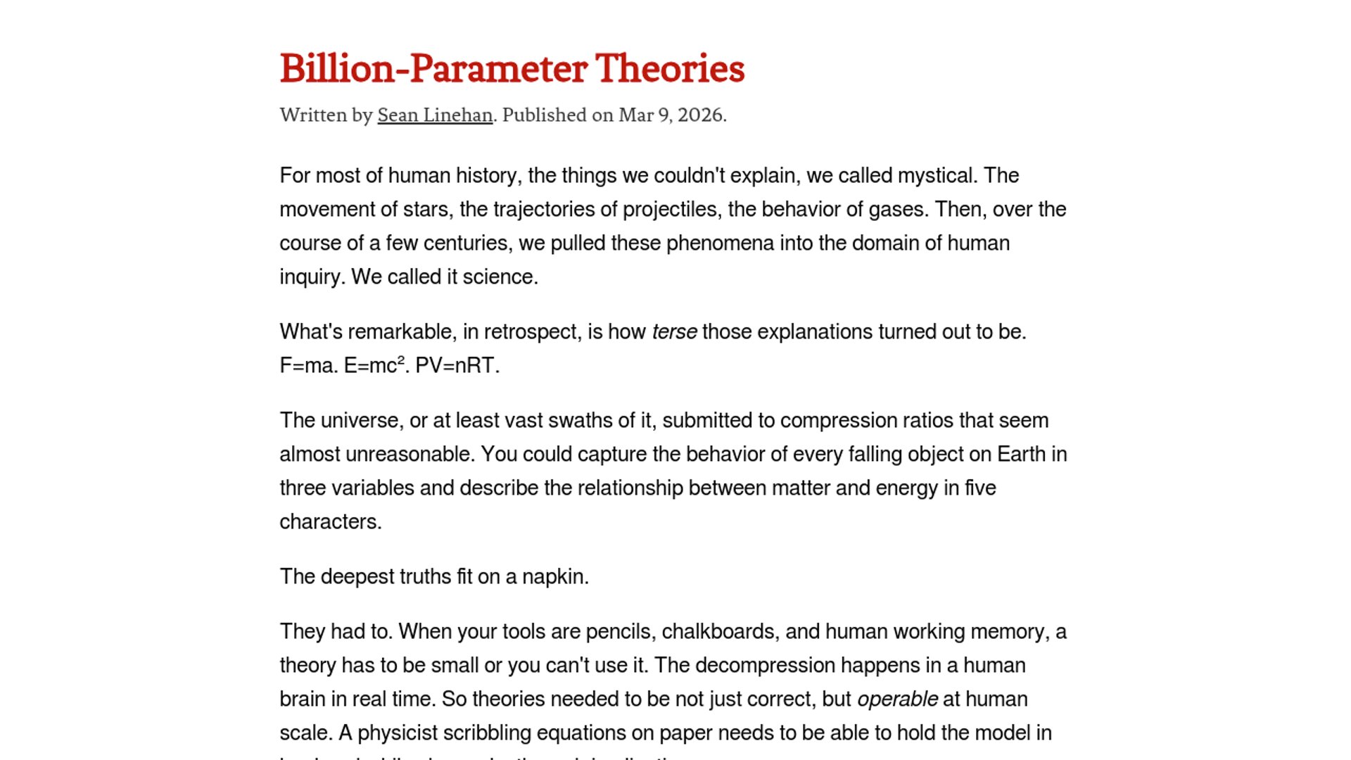 Sean Linehan argues that many real-world systems are too complex for the compact, equation-sized theories science traditionally prizes, and that modern AI offers a new medium for modeling them. The essay frames large models as operational theories of language, climate, markets, and biology, then points to transformer architectures and mechanistic interpretability as the beginning of a workable science of complexity.