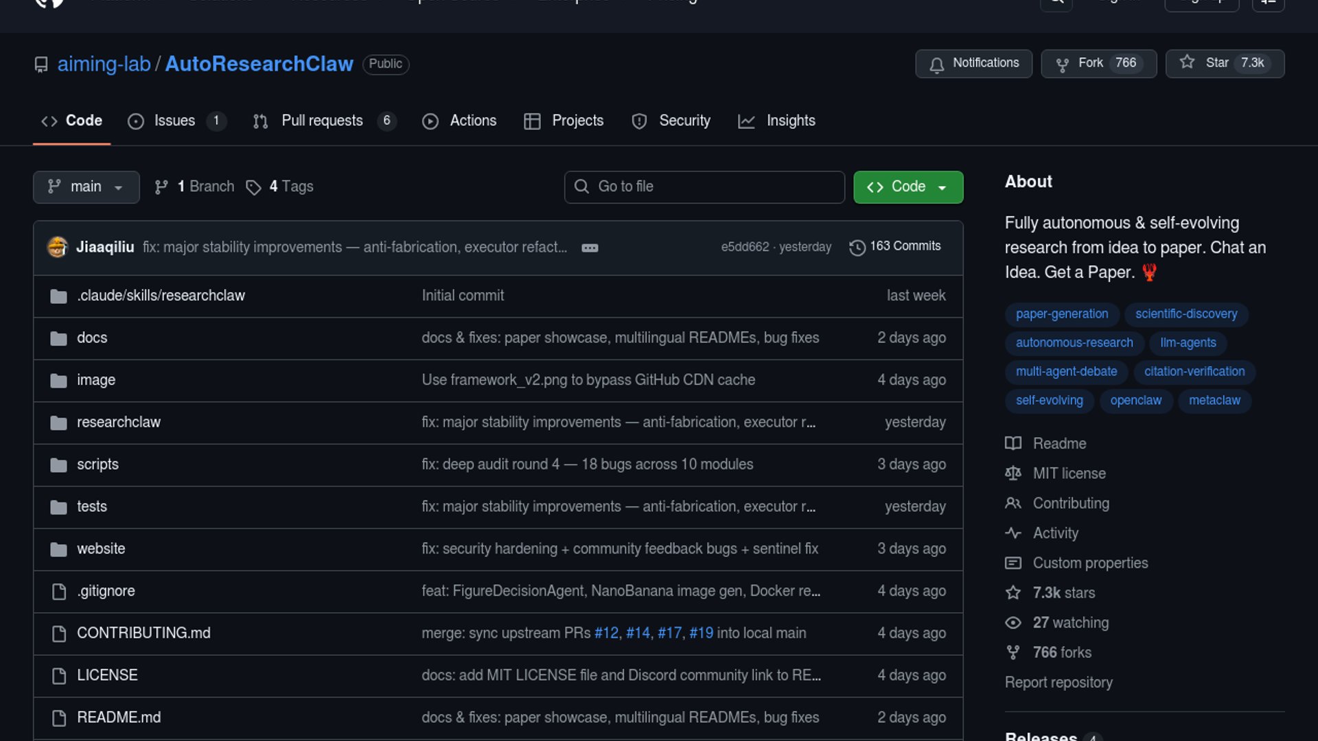 AutoResearchClaw is a fully autonomous research pipeline that takes a topic from literature review to experiments, peer review, and LaTeX paper output. The repo frames it as a self-evolving, OpenClaw-compatible system that can turn a research idea into a conference-ready draft with no human babysitting.