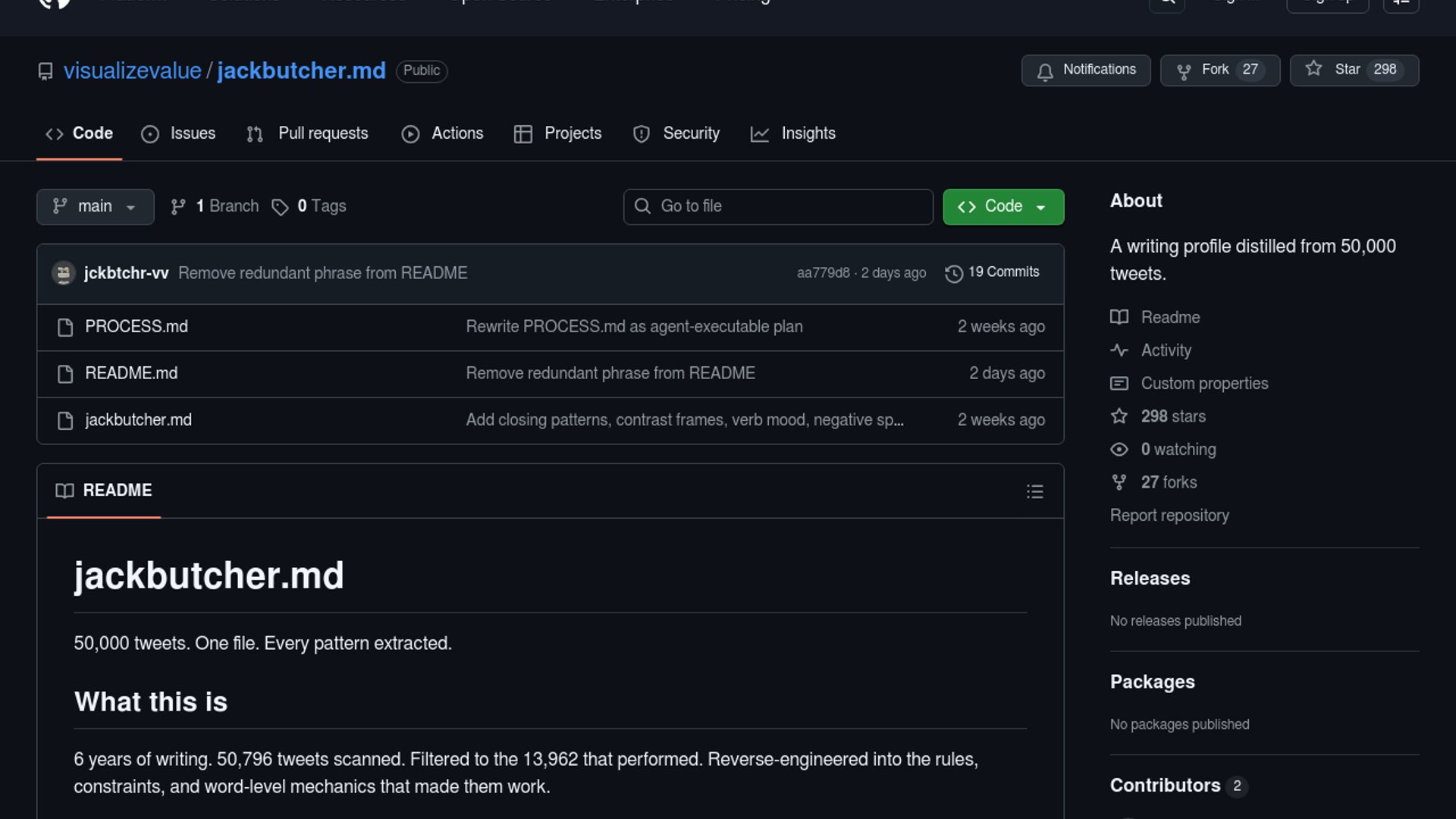 jackbutcher.md is a GitHub-hosted writing profile distilled from tens of thousands of Jack Butcher tweets and compressed into a drop-in system file for AI models. The repo doesn’t try to be a traditional app; it acts more like infrastructure for voice imitation, with extracted patterns covering sentence shape, perspective, punctuation, rhetorical moves, and word-level mechanics so a model can generate new copy in the same register.