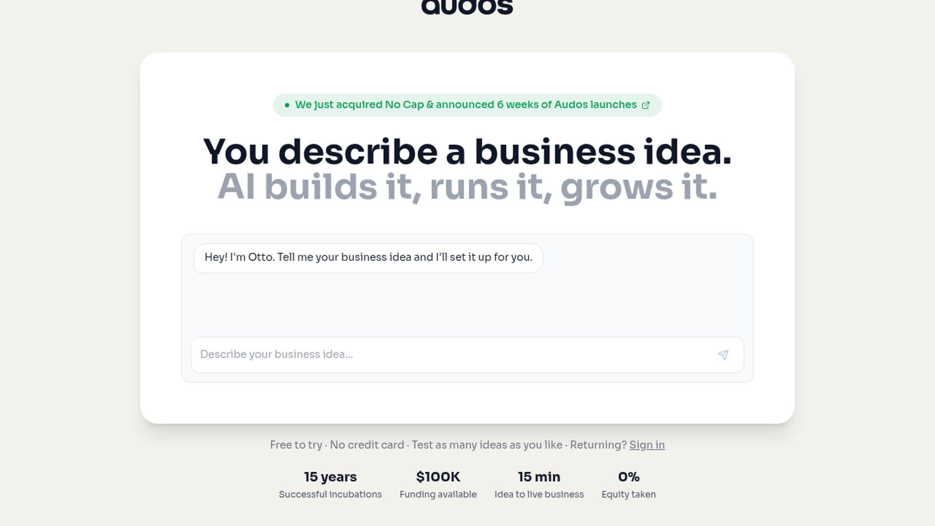 Otto is an AI co-founder from Audos.com that claims to take a founder’s idea from prompt to customer with minimal manual work. The product builds the landing page, runs ads, iterates on positioning, and pushes toward a first paying customer, with access via terminal workflow, OpenClaw, or Audos.com. Audos is also tying the launch to a small top-up model, saying it will invest up to $50 into an idea after a $1 deposit, which positions Otto as both an execution engine and a distribution experiment for solo founders.