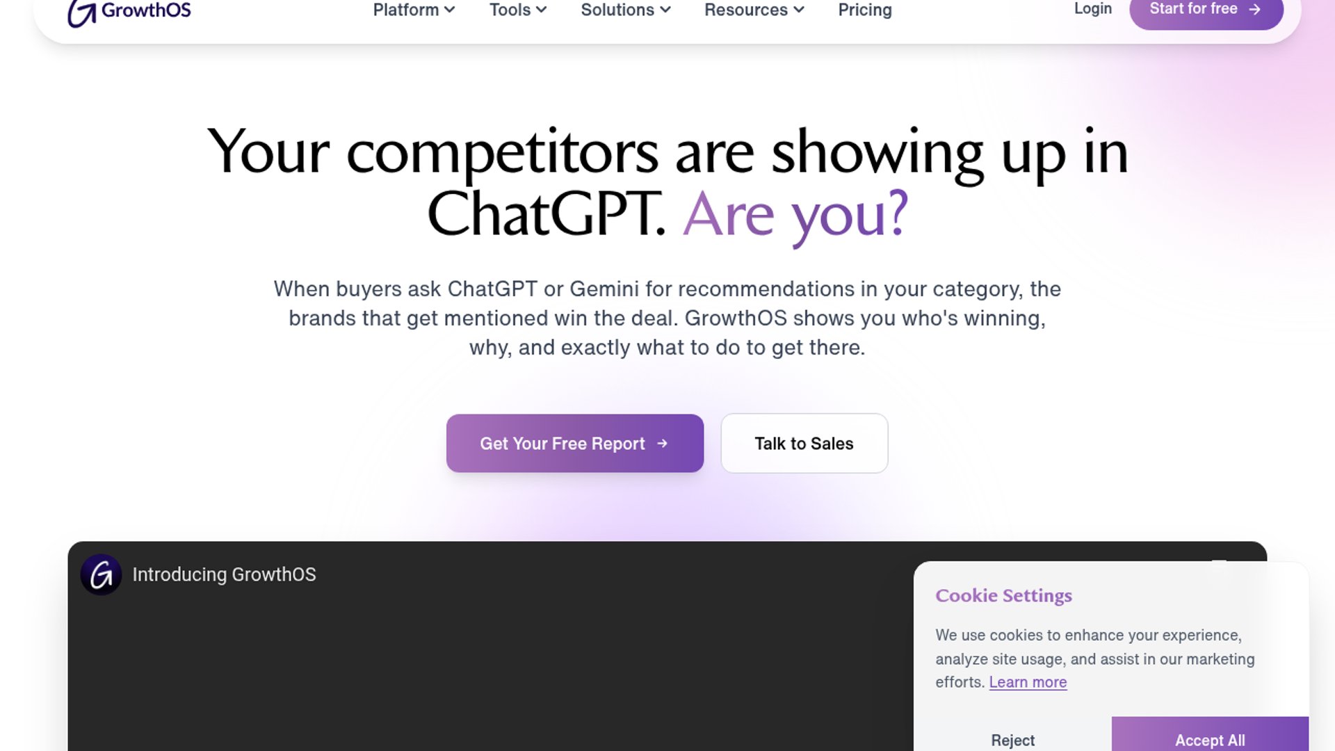 GrowthOS is an LLM visibility platform that tracks brand mentions and sentiment across AI engines like ChatGPT, Claude, and Gemini. It enables Answer Engine Optimization (AEO) by quantifying "share of voice" and providing optimization briefs to boost AI citations.