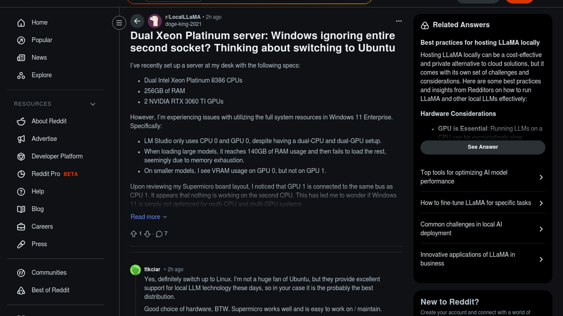 A LocalLLaMA user reports that a dual Xeon, dual RTX 3060 Ti server on Windows 11 Enterprise only uses one CPU socket and one GPU in LM Studio, then fails around 140GB RAM when loading larger models. The post frames it as a likely NUMA and multi-device scheduling problem and considers Ubuntu Desktop as a workaround.