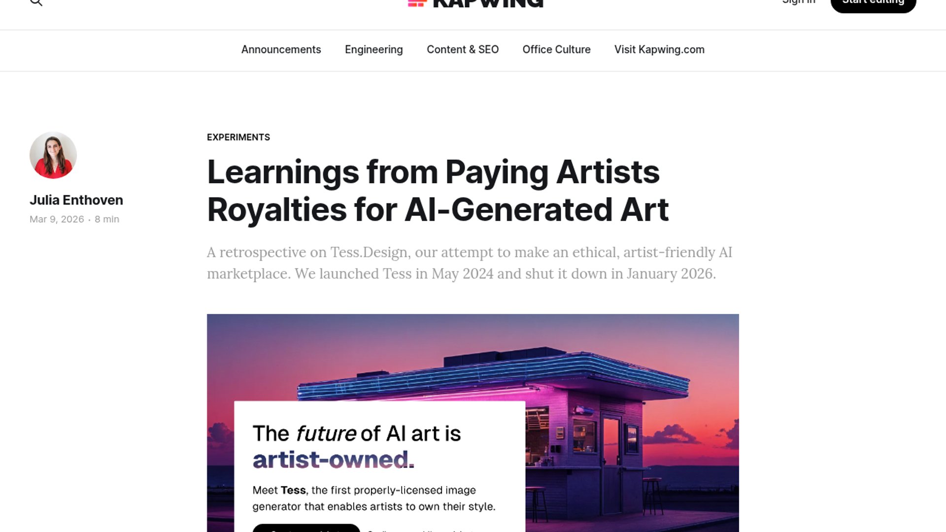 Kapwing published a candid postmortem on Tess, its licensed AI image marketplace that paid artists 50% royalties per generation. After launching in May 2024 and shutting down in January 2026, the team says weak marketplace economics, unresolved copyright risk, and the cost of splitting focus away from Kapwing made the model unsustainable.