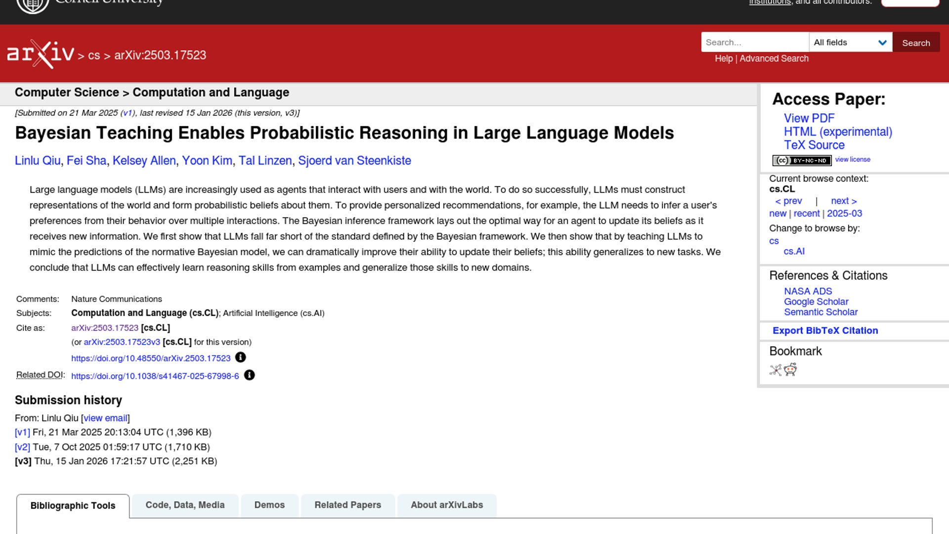 Google Research’s Bayesian Teaching fine-tunes LLMs on trajectories from an optimal Bayesian assistant, teaching them to maintain uncertainty and revise beliefs over multi-turn interactions. The paper reports better belief updating on the training task and transfer to unseen domains like web shopping and hotel recommendations.