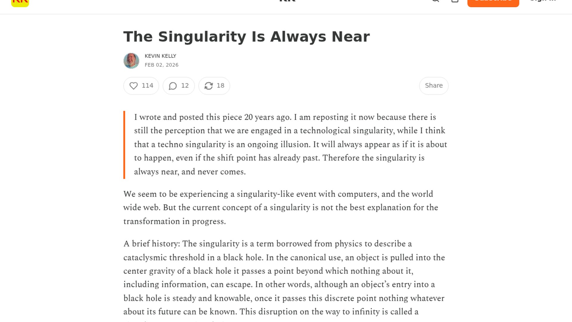 Kevin Kelly’s classic essay, recently reposted, argues that the technological singularity is an ongoing illusion of exponential growth rather than a discrete future event. By analyzing the mathematical perspective of exponential curves, Kelly suggests the "event" is always perceived as imminent regardless of where we stand on the timeline, stripping the concept of its pseudo-religious status.
