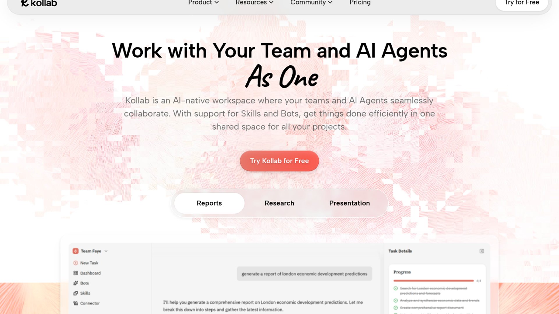Kollab is an AI-native team workspace that puts agents, reusable Skills, bots, connectors, memory, and knowledge retrieval into one shared execution layer. Its Product Hunt launch positions it as a way to bring MCP-backed agents into Slack, Telegram, GitHub, Notion, Linear, Figma, and other daily tools without each teammate maintaining a separate setup.