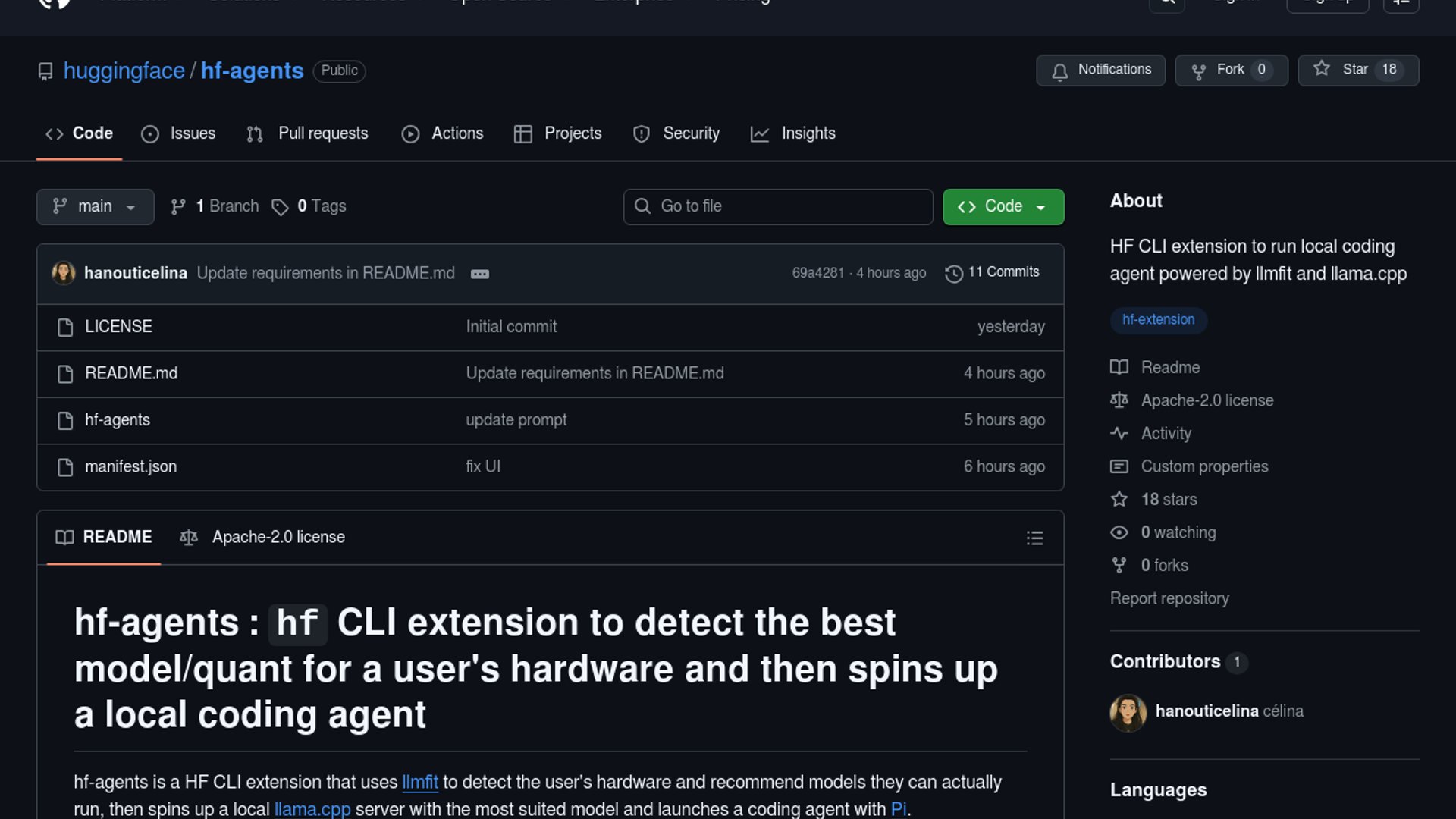 hf-agents is a Hugging Face CLI extension that uses llmfit to detect your hardware, recommend a runnable model and quant, start a local llama.cpp server, and launch Pi as a coding agent. It turns the usual local-LLM setup dance into a single guided flow.