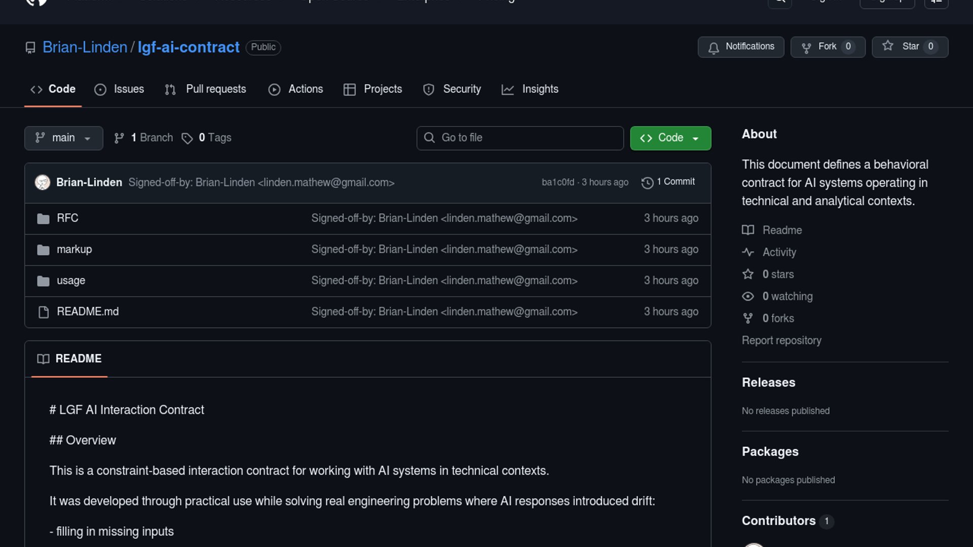 LGF AI Interaction Contract is a small open-source spec for constraining AI behavior in technical work by forcing explicit unknowns, preserving multiple solution paths, and refusing to fill in missing inputs. It is aimed at coding, debugging, systems design, and other places where “helpful” guesses create costly drift.
