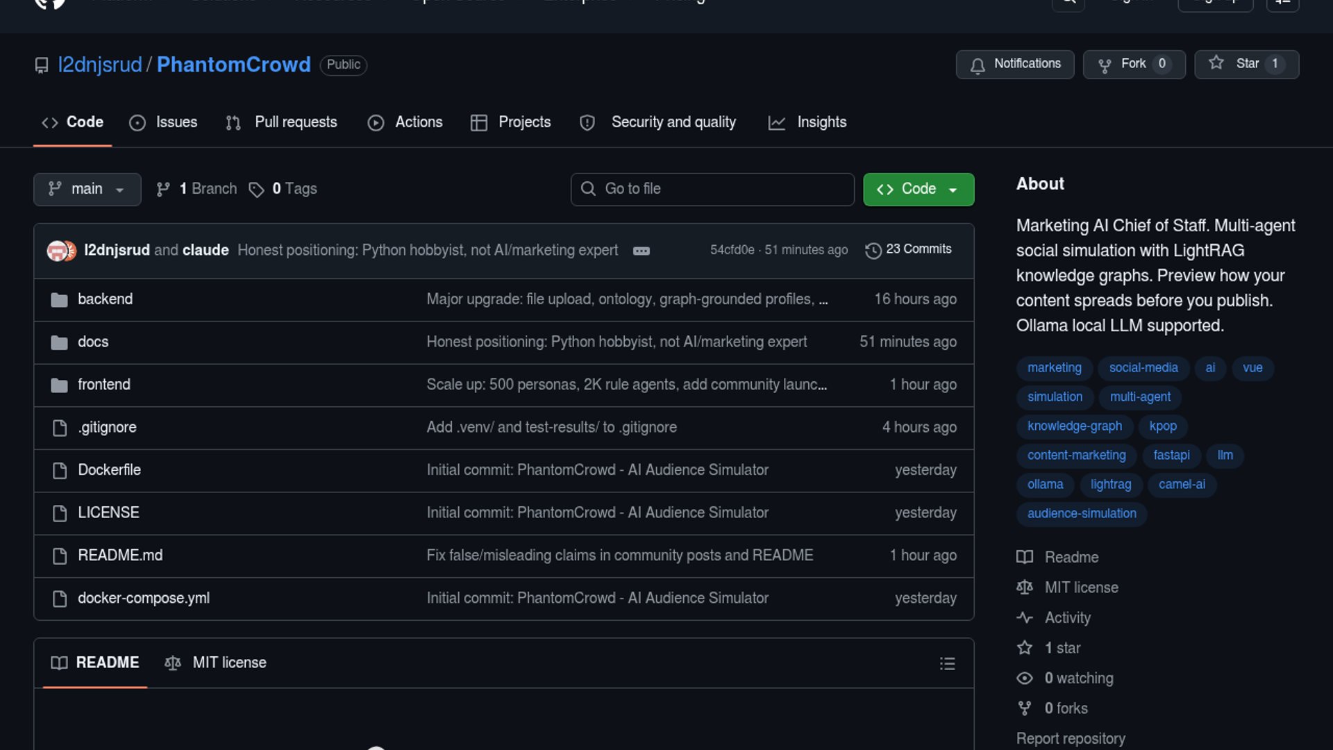 PhantomCrowd is an open-source, fully local marketing simulation platform that uses Ollama-backed LLMs, LightRAG, camel-ai, and a simulated social network to preview how content might spread before publishing. It can generate 10 to 500 personas for quick reactions, or run a larger campaign mode with up to 100 LLM agents and 2,000 rule-based agents, then turn the results into a marketing report with viral scoring, segment analysis, and recommendations. The project emphasizes privacy and low cost by avoiding paid APIs and cloud services.