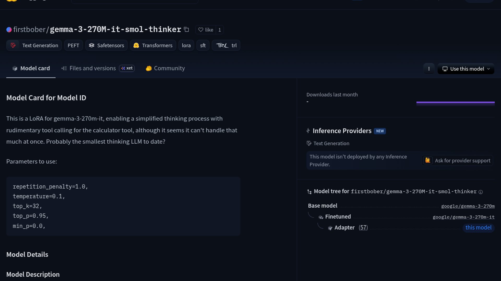 - –Gemma 3 270M is already a tiny base, so even a modest adapter that preserves structure is useful for edge and hobbyist experiments