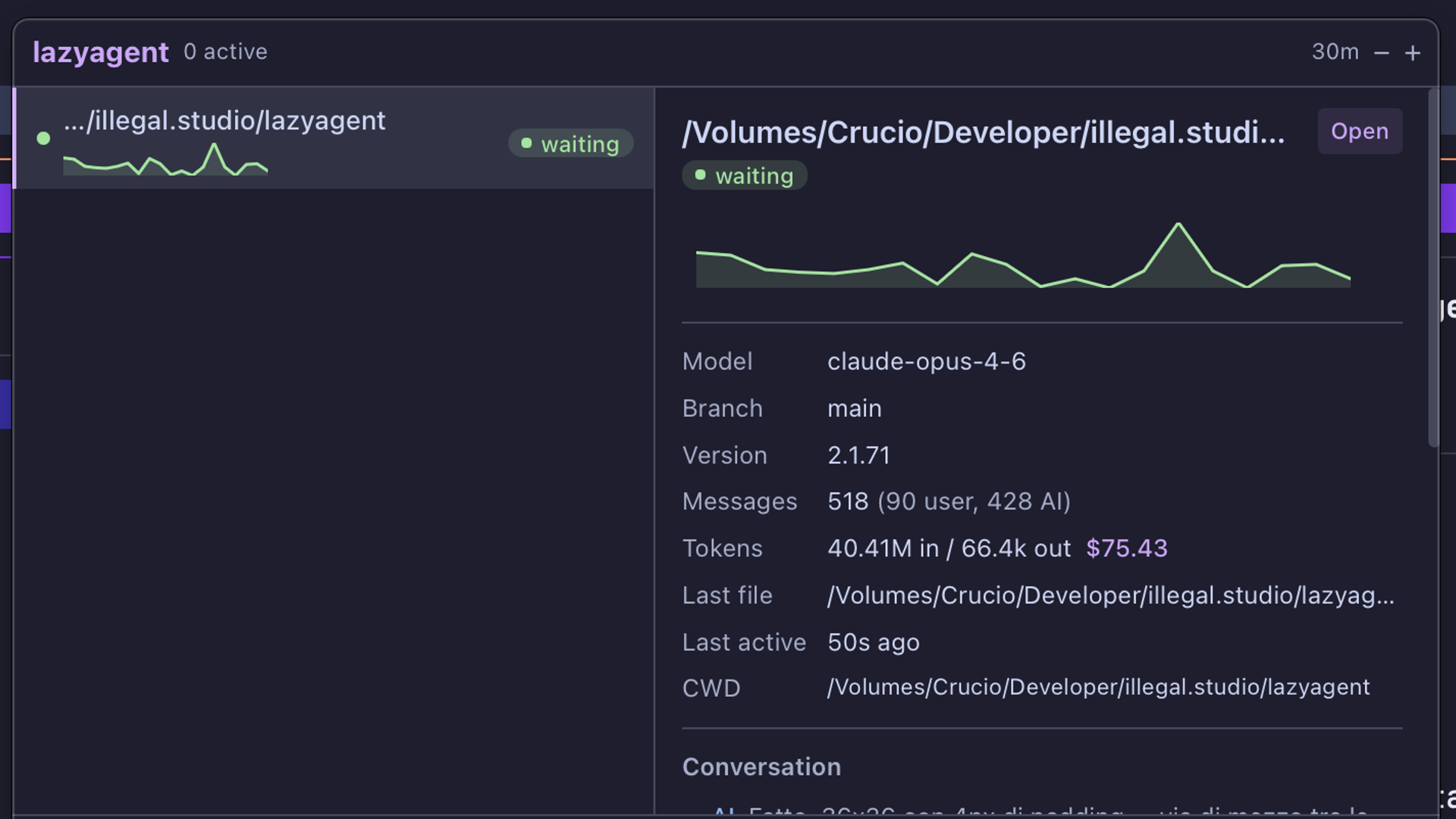 Lazy Agent is an open-source TUI and macOS menu bar app for monitoring Claude Code sessions by reading local JSONL transcripts and surfacing activity states, tool usage, recent conversation, repo context, and estimated token cost. It gives heavy Claude Code users a lightweight observability layer without modifying the agent itself.