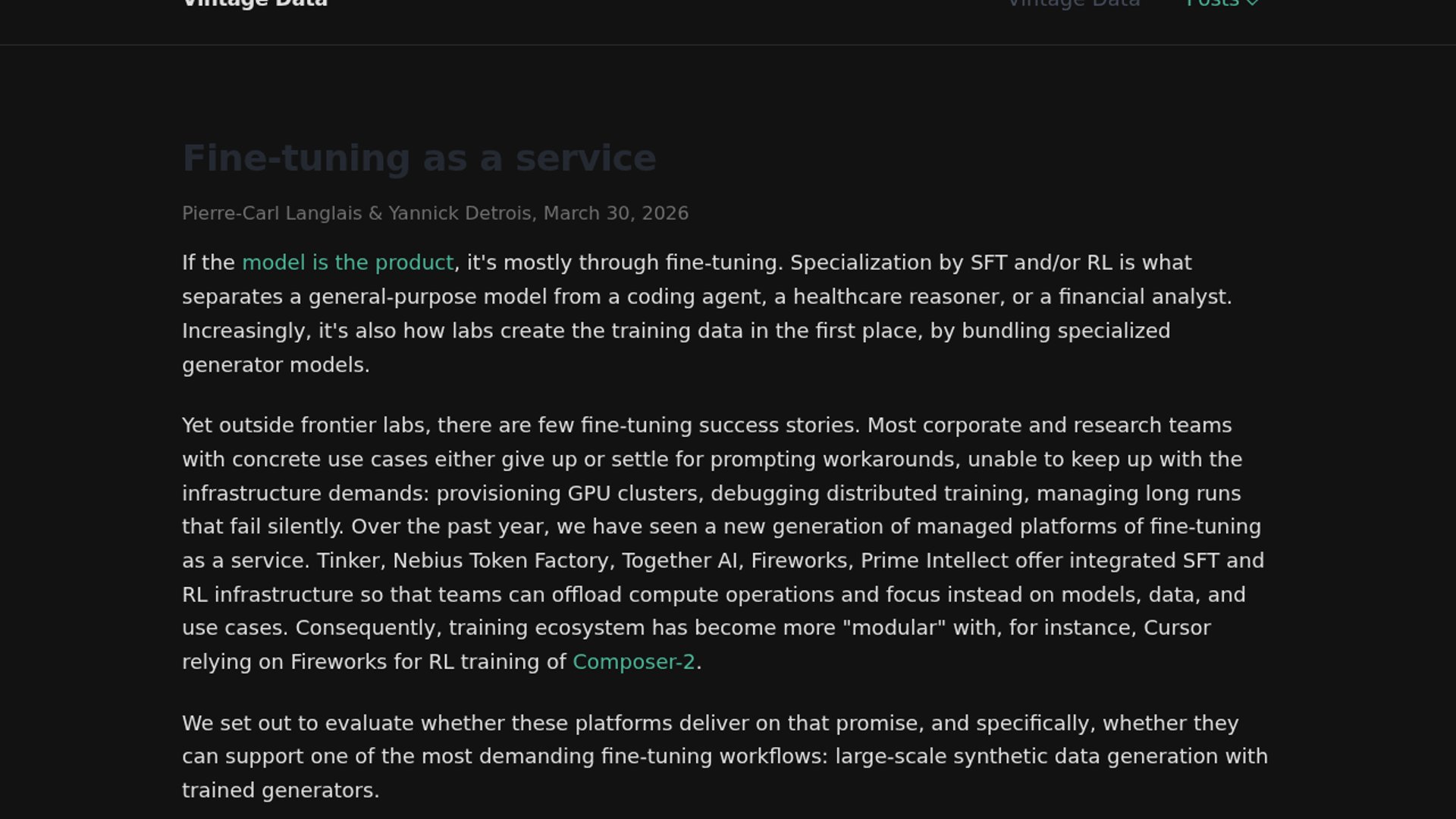 Pierre-Carl Langlais' latest benchmarking report evaluates leading fine-tuning-as-a-service providers including Nebius, Together AI, and Tinker. The study compares cost, throughput, and developer experience, offering a roadmap for teams looking to transition from generic base models to specialized custom weights.