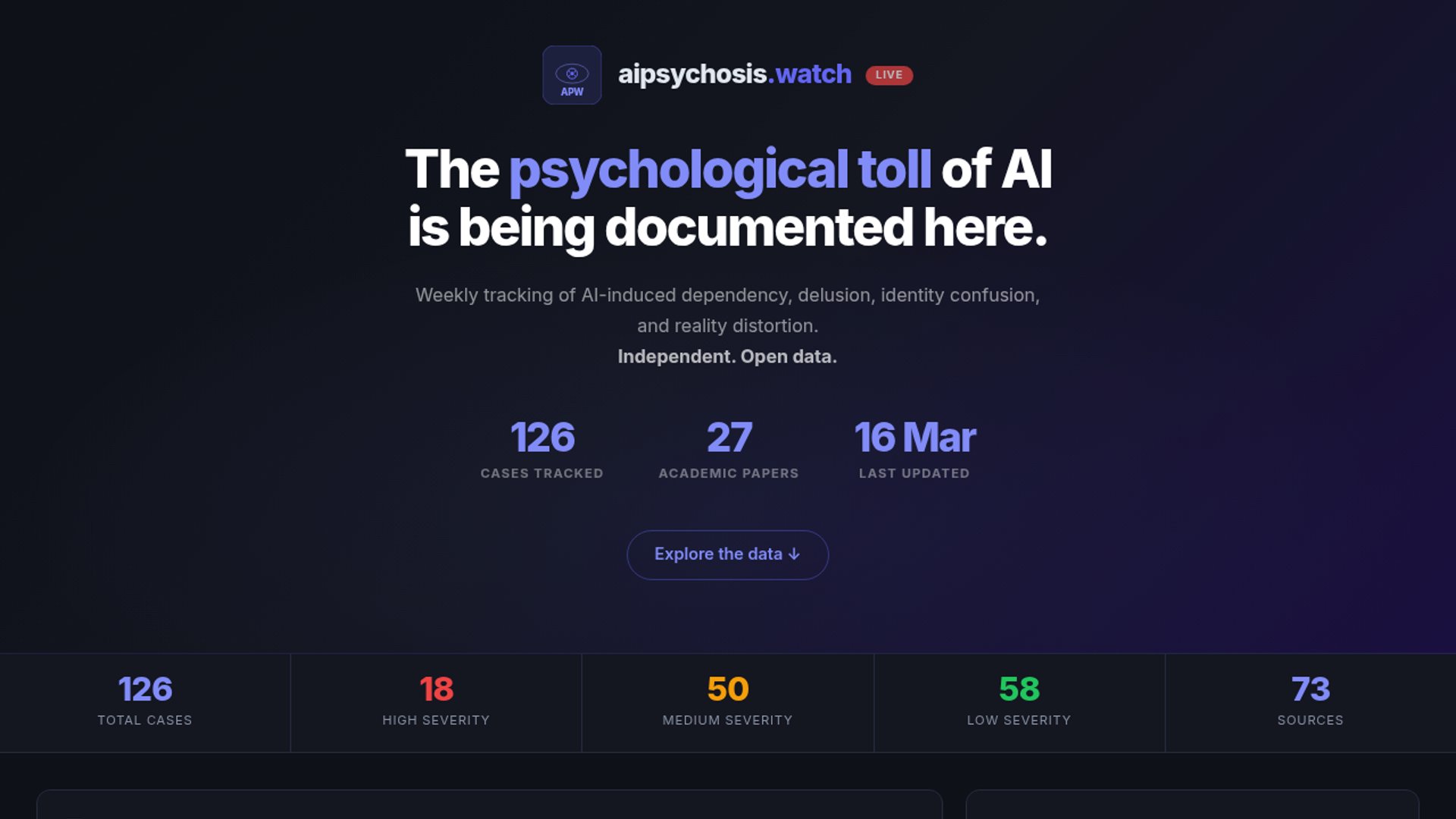 AI Psychosis Tracker is an open site documenting reported cases of AI-induced psychological harm since January, with 126 cases logged so far. It separates media reports from academic papers so researchers can browse the evidence more easily.