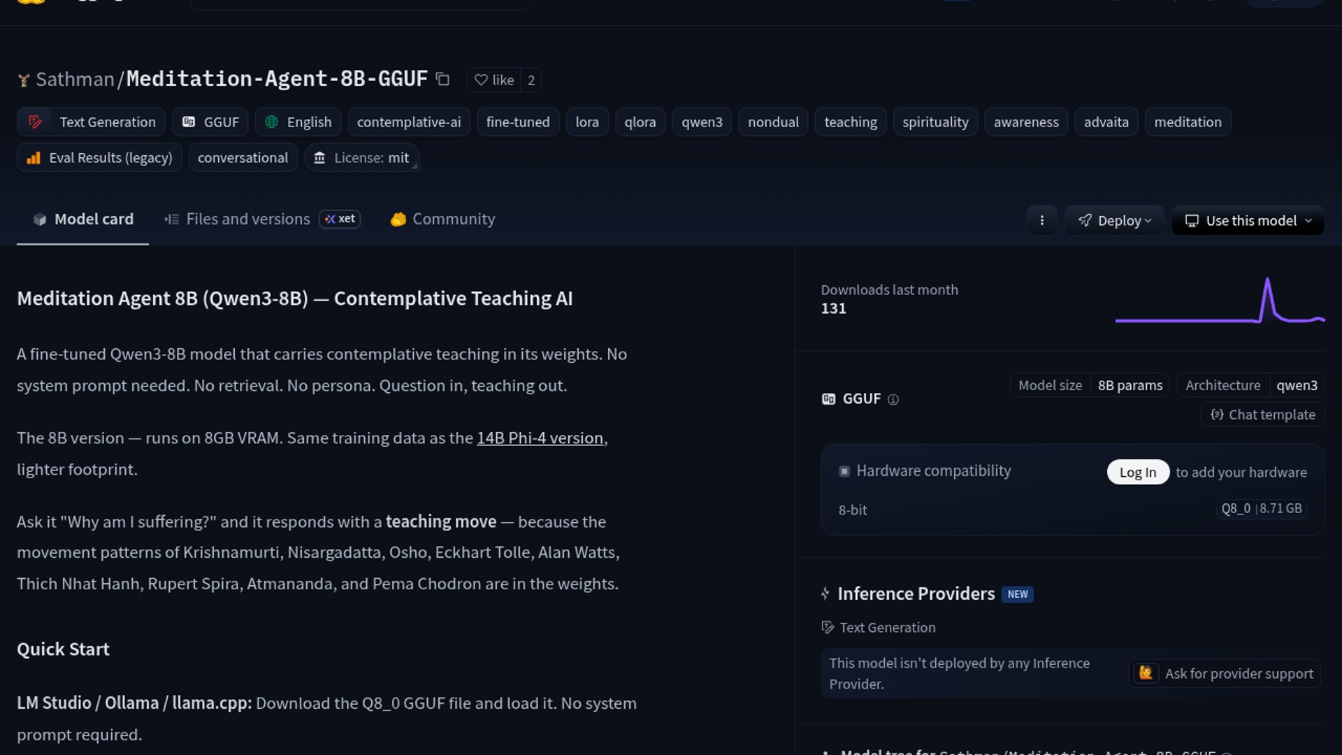 This is less about “AI spirituality” gimmickry than about proving a style can be baked into weights and still survive local deployment. The interesting question is whether the model preserves insight-level clarity, or just a convincing cadence of wisdom.
